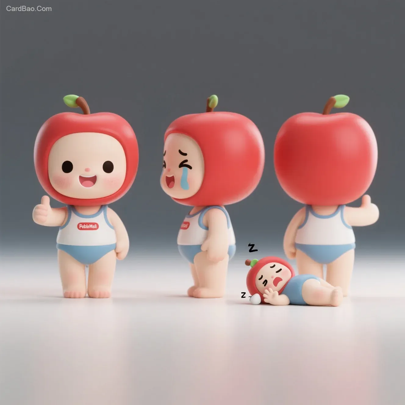 3D cartoon character design, blind box, red, anthropomorphic apple baby with a headpiece, wearing a small vest, cute and playful, front view, side view, back view. Also includes sticker designs: various exaggerated expressions and actions, such as happy, laughing, thumbs-up, angry, crying, thinking, lying flat, greeting, sleeping, etc. Clean background, high-end, full of creativity. The top row showcases the IP effect in three views.