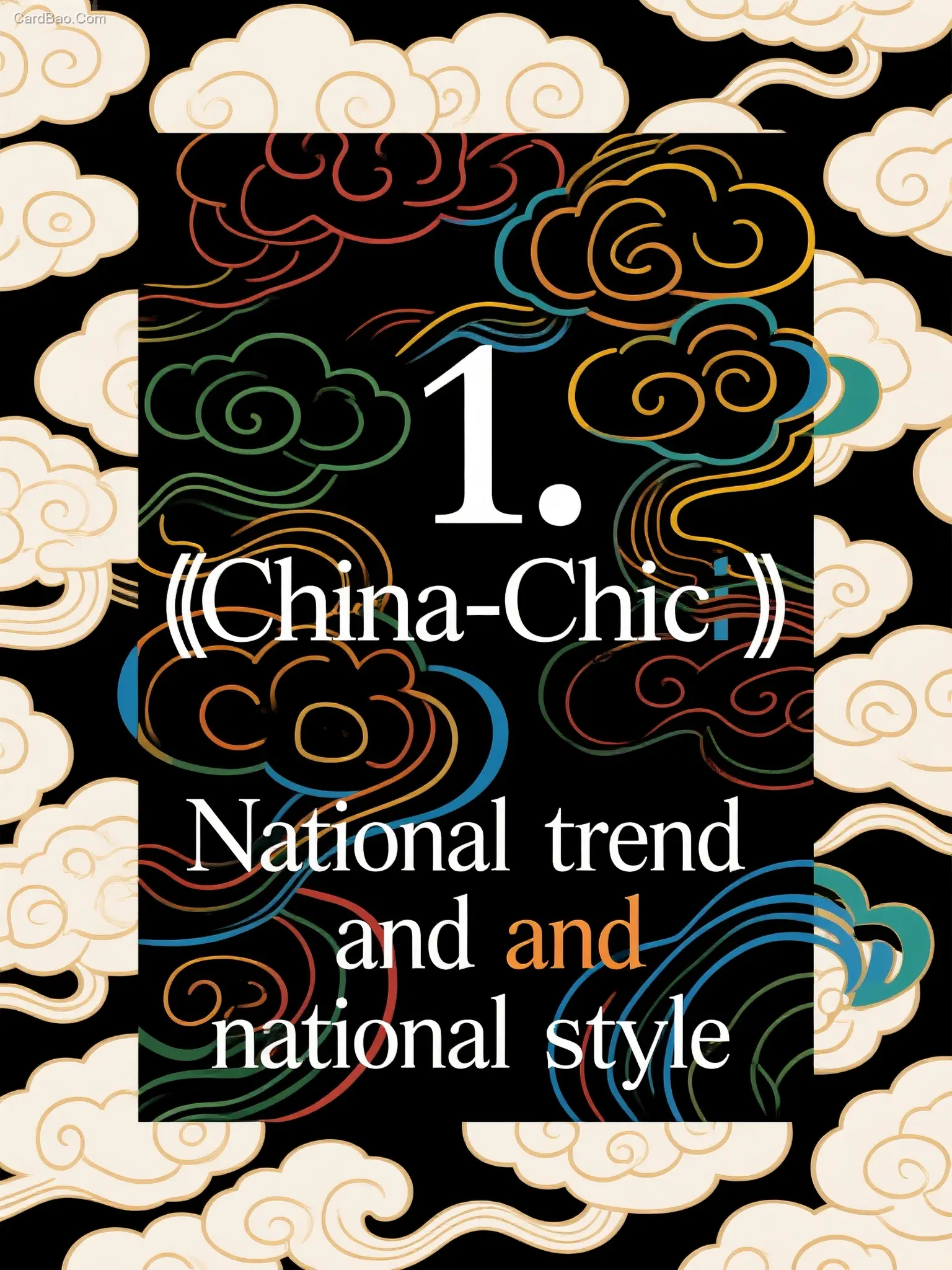 China-Chic, complex lines, black background with "1. National trend and national style", photographic style. Boldly layered color scheme, minimalist composition, direct content description. Traditional auspicious cloud background pattern, clear picture layers, bright colors, blending tradition and modernity, simplicity and high-end.