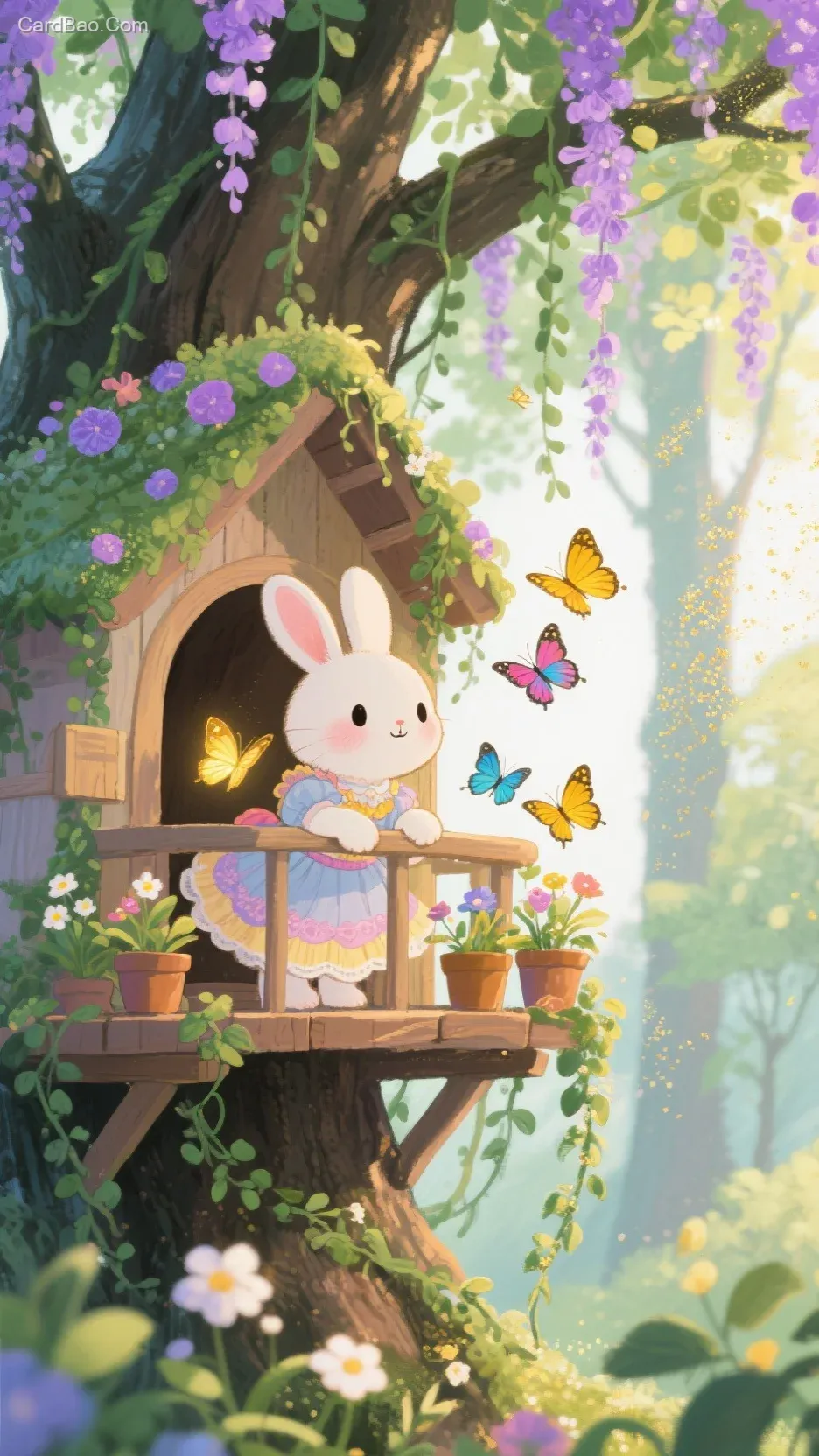 色彩颗粒,治愈水粉,随笔涂鸦,治愈插画,一只可爱的小兔子,穿着好看的裙子,住在树屋里,小兔子趴在树屋露台的围栏上看蝴蝶,身边有一些彩色的小蝴蝶在飞舞,蝴蝶散发着金黄色的光芒,旁边有几盆小花,背景是开满紫色花朵的藤蔓大树,枝叶垂下来,花朵,深绿和浅绿的绿植,前景是藤蔓和小花朵,远景是森林大树