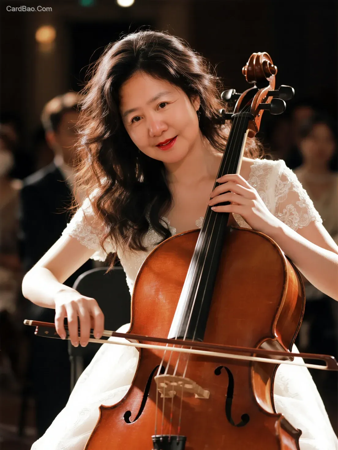 ## A girl playing cello in a competition, with soft, fluffy long curly hair. Techniques include smudging, overlapping transparency, color zone division, dynamic sketching, texture expression, aerial perspective, layered rendering, positive and negative space, pointillism, wet-on-wet painting, anatomical structure, tension lines, optical illusion, and gradient blending.