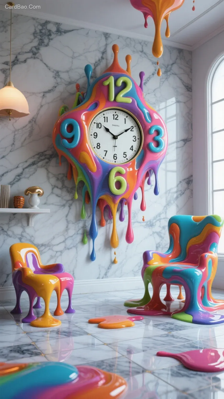 Salvador Dalí, melting clock, liquid furniture, digital melting state, dripping onto the polished marble tiles indoors, creating a strong sense of temporal and spatial dislocation. Colorful liquid, C4D rendering.
