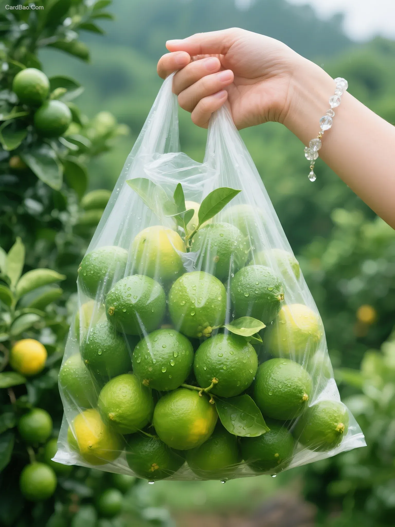 创作一幅写实风格画面,一只手提着超大的高透光透明塑料袋,袋中装满海南小青柠,数量很多,果实饱满呈椭圆或近圆形,个头小巧。表皮是浓郁且富有生机的青绿色,带有自然的光泽,带有自然的细微纹理,有的表面布满细密、晶莹的水珠,仿佛刚从果园采摘,显得格外鲜嫩多汁,它们紧密地簇拥在一起,部分小青柠微微露出青黄相接的果蒂。部分带着翠绿叶片,背景是绿意朦胧的果园,有青柠树和未摘小青柠点缀,手腕配水晶手链,突出小青柠新鲜水灵、现摘现发的质感与氛围,用于抖音带货场景 。超高清摄影8k画质