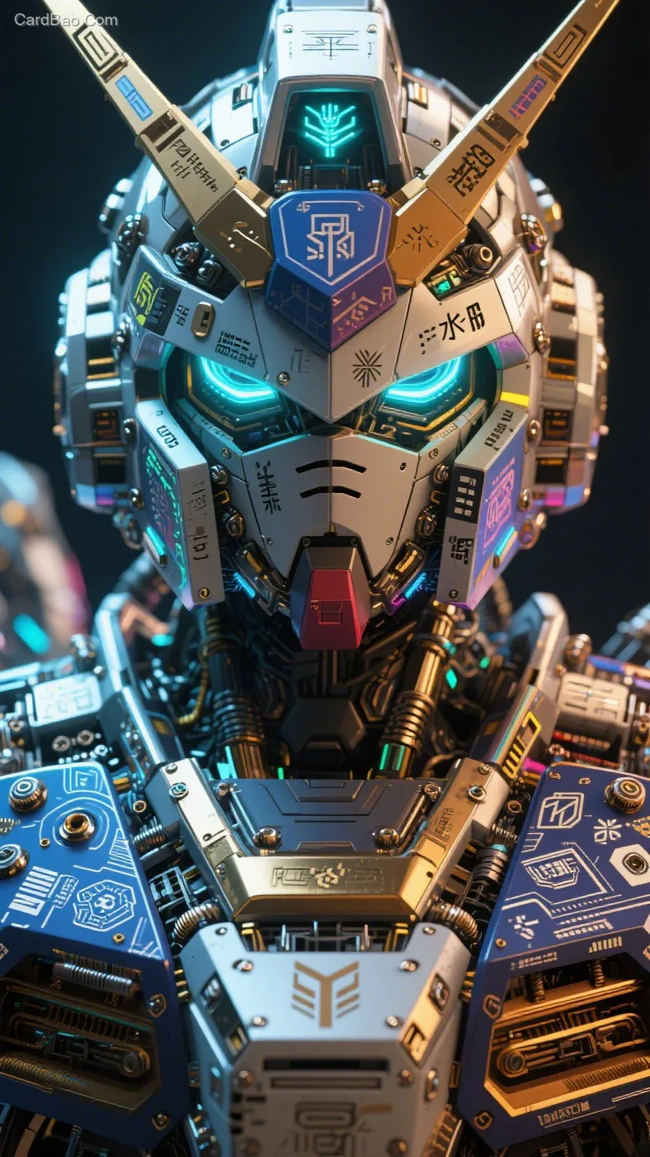 Hyper-realistic, lifelike expression, Gundam face, masterpiece, upper body, close-up perspective, mecha with numerous facets, rich metal detailing. Every facet of the mecha is embedded with countless small metal components, adorned with numerous Gundam decals, each surface covered in intricate runes and circuit patterns, showcasing an astonishingly complex mechanical structure. Futuristic sci-fi style, electric vibe, the mecha features an abundance of mechanical part details, ornate, and exquisitely refined. Strong realism, mechanical aesthetic, high-definition, vibrant colors, hyper-realistic photograph, robot, 8K resolution.