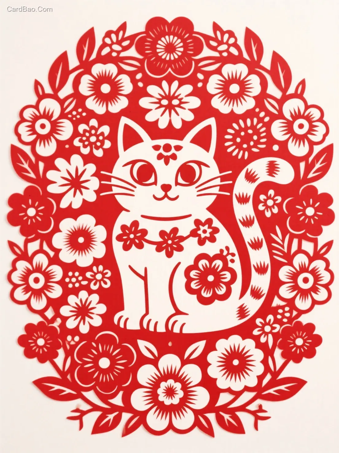剪纸艺术风格作品,红白配色,主体是一只猫,被繁花簇拥。猫造型简洁夸张,圆眼、花纹装饰增添童趣,花朵形态多样,有写实也有变形,丰富视觉。构图上,以猫为中心对称布局,规整又具装饰性,符合传统剪纸对称美学,营造平衡稳定感 。艺术风格受民间剪纸影响,线条质朴,对比强烈,凸显图案轮廓,有浓郁民俗韵味,传递出天真、质朴的艺术氛围,仿佛是民俗文化里守护美好、带来生机的象征,借简洁图案传递对自然与生活的热爱,也展现传统手工艺的独特魅力 。