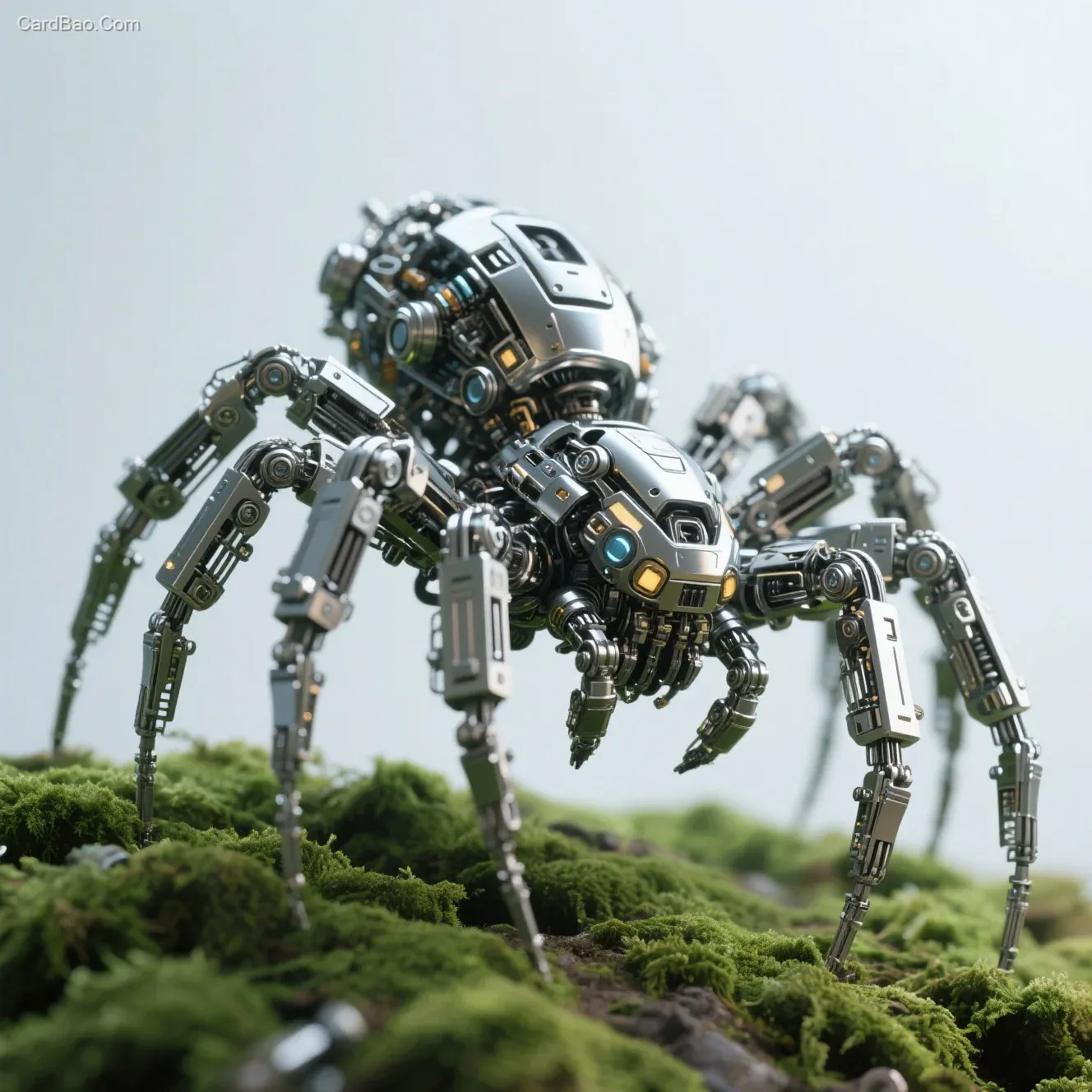 A spider composed of countless mechanical components, exuding a metallic sheen, with intricate mechanical details clearly visible, showcasing a strong sense of technology and futuristic vibe, set against a background of moss.
