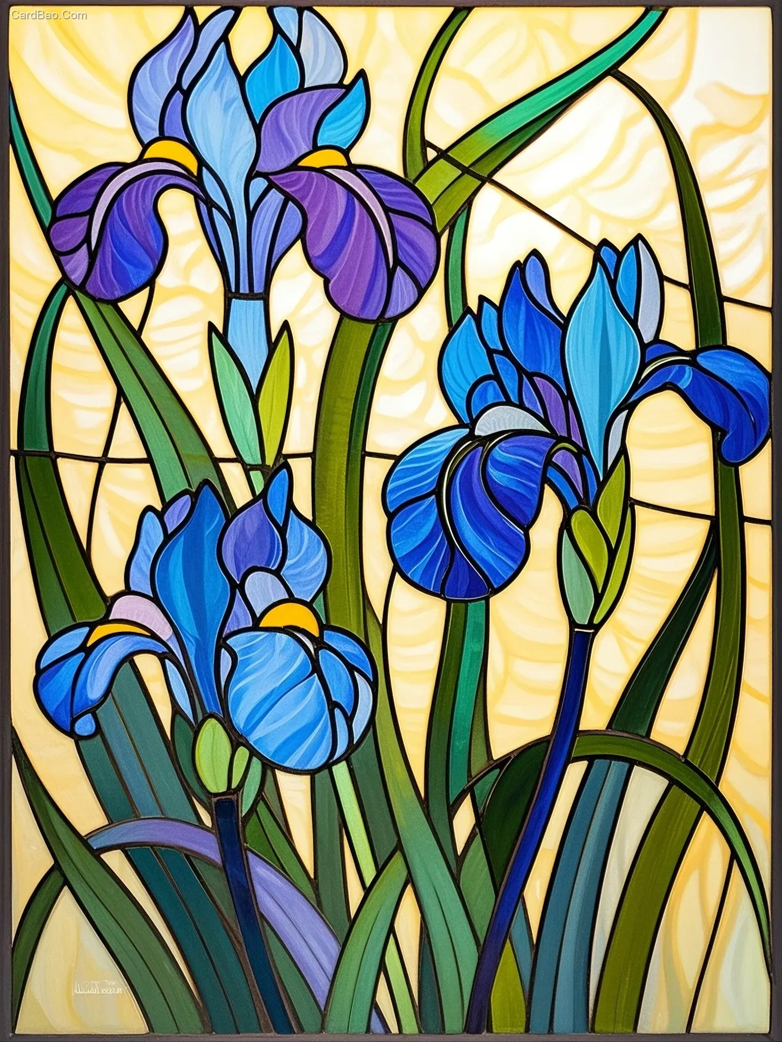 Masterpiece of world stained glass mosaic art, classic Art Nouveau patterns, in the style of Eric Bonte, exquisite colored glass artwork featuring 3-5 elegant iris flowers in varying shades of blue + purple + indigo, slender green leaves in graduated tones, natural gradient curved background, flowing lines, asymmetrical composition, dreamlike vintage atmosphere. High-quality details, OC render, ultra-HD resolution, best quality, 8K wallpaper.
