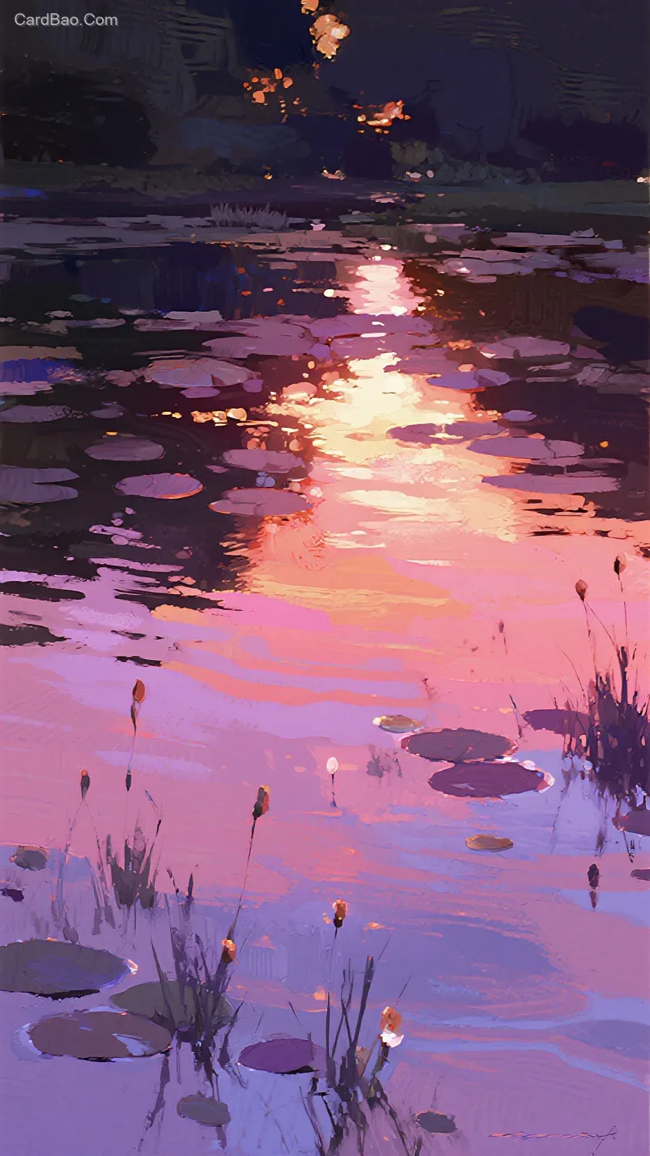 帮我生成图片:这是一幅具有磨砂肌理的水粉插画,采用抽象写意的艺术风格,笔触感清晰明显。画面以粉紫色为主色调,在暖色的背景上精心留出了适度的空白区域。画面中央的水潭之中,长满了色彩饱满的晚霞倒影,倒影晶莹剔透,表面泛着微光,呈现出浸润、流变且朦胧的视觉效果,营造出充满艺术感与空间感的画面氛围。比例 9:16。