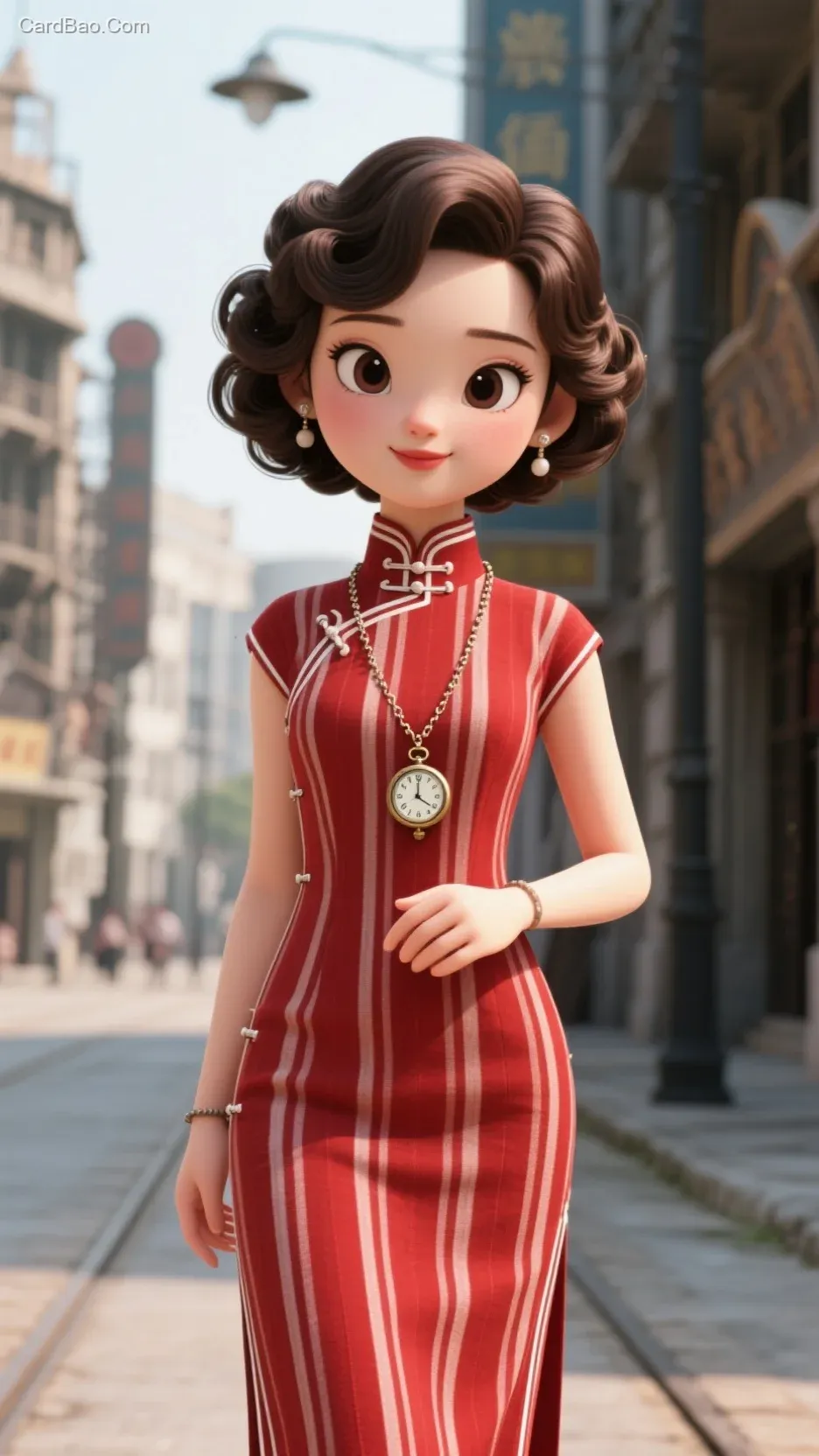 Realistic chibi-style beauty, Republic of China era aesthetic, vintage wavy hairstyle, wearing a long red cheongsam with white striped patterns, full-body view, standing on old Shanghai streets, small pocket watch accessory chain hanging on chest, cinematic style