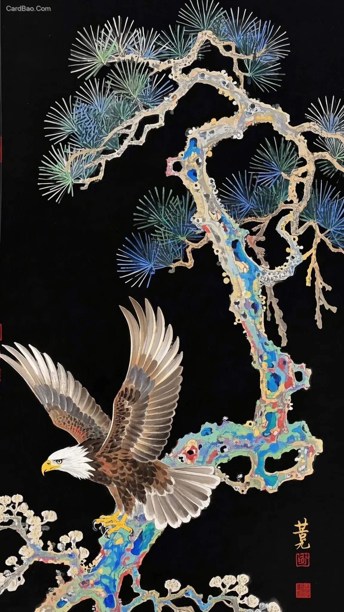Masterpieces of Chinese Arts and Crafts Masters, Neo-Chinese style, Minimalism, Mother-of-Pearl Lacquer Painting, in the style of Li Aizhen, Mother-of-Pearl "Pine Tree and Eagle" Lacquer Painting, black lacquer background, multicolored mother-of-pearl, iridescent pearl hues, vibrant and dazzling colors, Chinese aesthetic, ancient cyberpunk, Yangzhou Dot-Lacquerware, generous use of negative space, high-quality detailing, high resolution, best quality, 8K wallpaper.