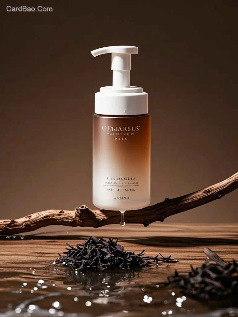 Shoot from a low-angle perspective to create a high-end beauty product display image. The main subject is a bottle of foaming cleanser with a cylindrical, gradient beige-to-white frosted glass body and a white pump head. The product appears to float, with water droplets dripping down the bottle. Below it lies a dry twig, and scattered on the ground are a few black tea leaves. The background incorporates textured dark wood panels. The scene is set in a dark, sophisticated ambiance with a warm brown color palette, transitioning from deep to light brown in the background, which gradually blurs. The style aligns with high-end beauty advertisements, featuring a warm brown-dominated color scheme, a centered focus composition, and staggered product placement. Details include strong light-dark contrasts on the product, as well as soft and natural lighting to craft a refined and luxurious atmosphere.