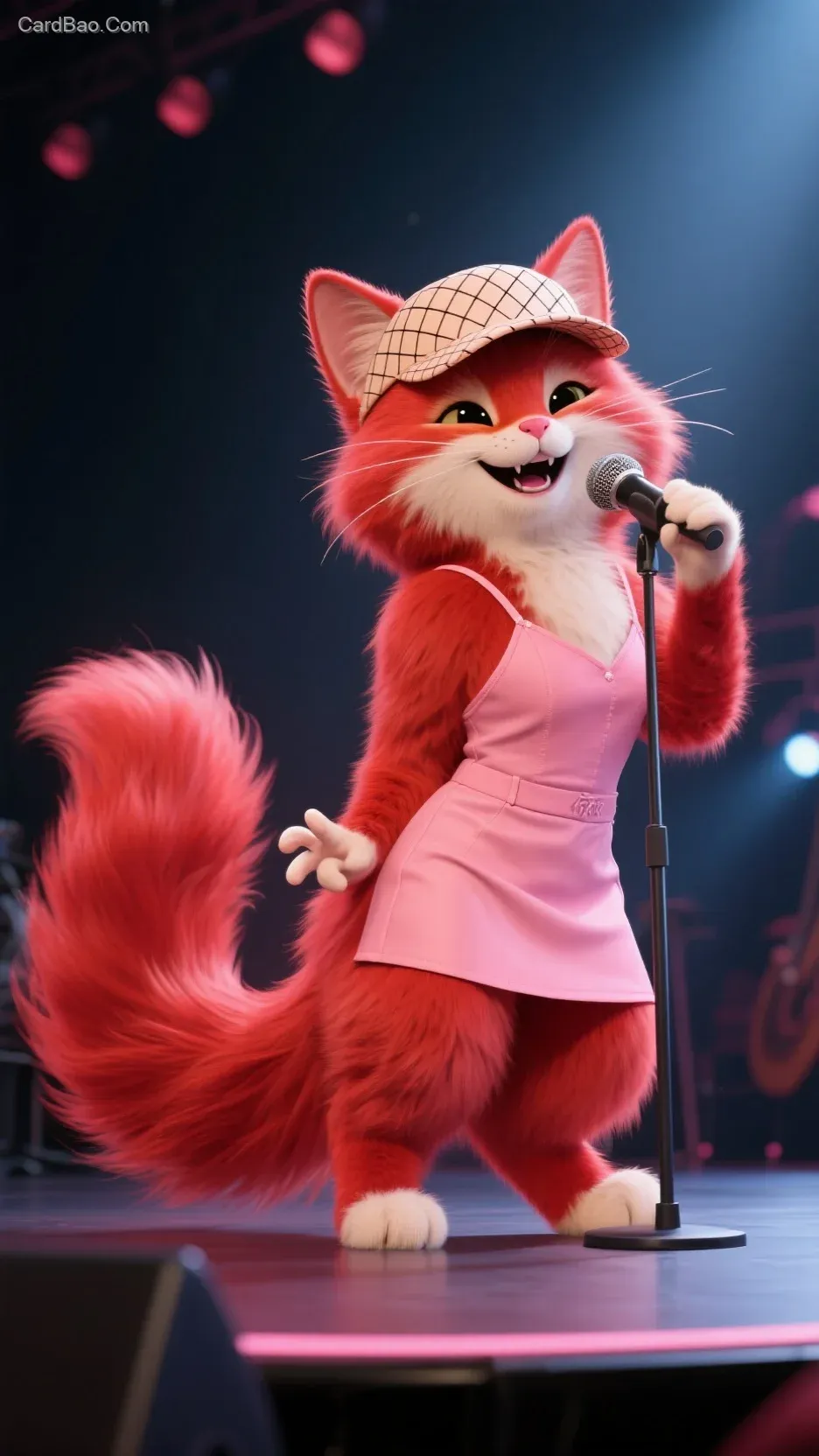 一只红色长毛猫咪,长长的毛很红细腻光滑,长毛纹理清晰,头戴明星演唱时的网格遮阳浅帽脸长的像狐狸穿着粉色吊带短裙,笑脸很谄媚,在舞台上对着话筒唱着等你来的歌,还不停后挠手弄姿很妩媚4D渲图