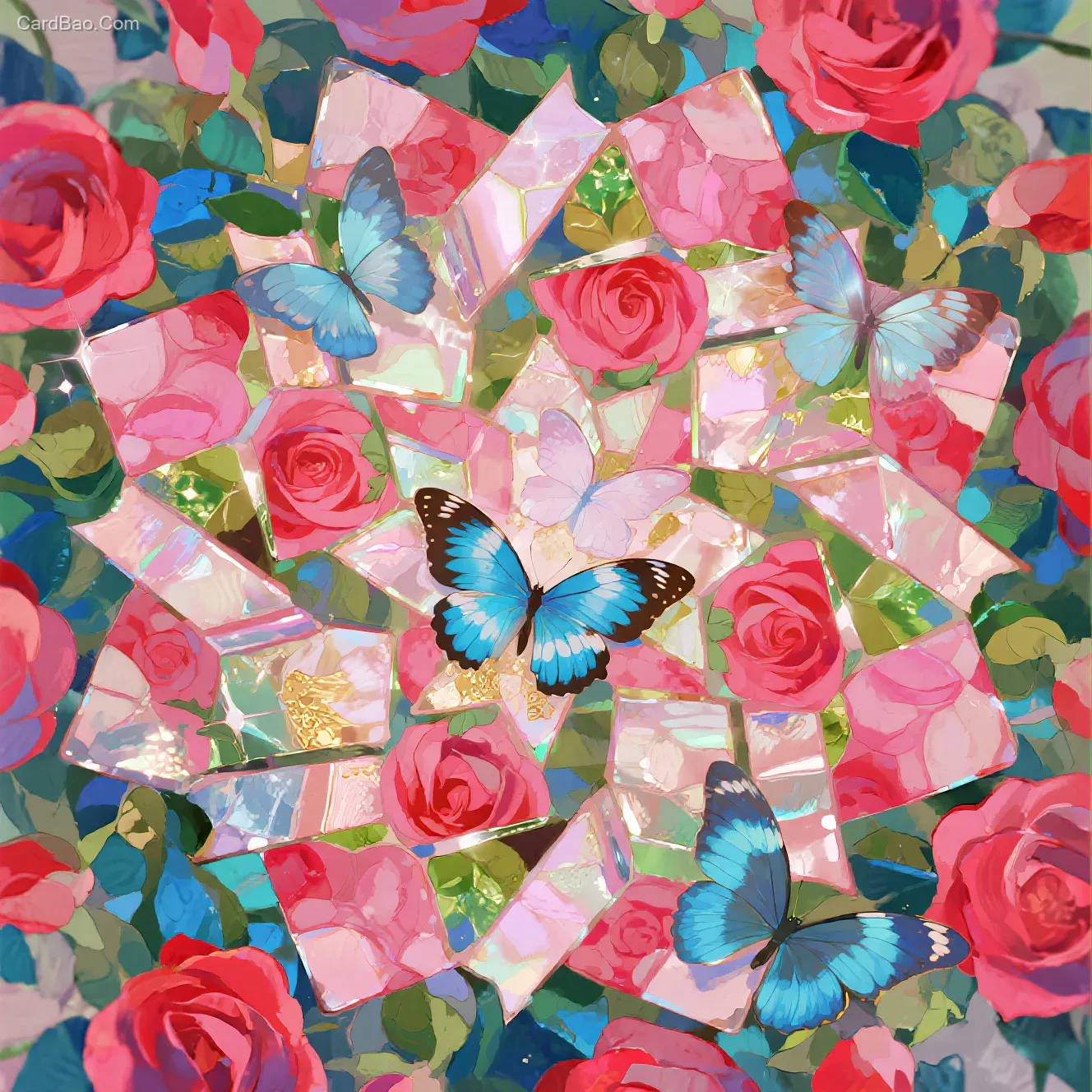 旋转万花筒占据画面中心,碎玻璃拼成流动花园,玫红玫瑰变浅粉蔷薇,靛蓝蝴蝶闪银绿光,碎片绽金红花镶发光蓝边,梦幻童话风格,水彩质感柔光效果
