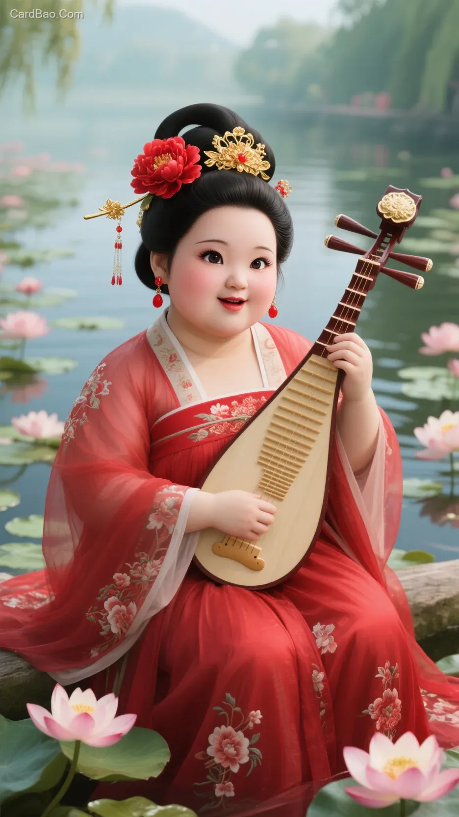 Dressed in a formal crimson Hanfu made of sheer red gauze, the sleeves and hem are embroidered with floral patterns, while the inner lining is also crimson. She sits on a bamboo raft floating on a lotus-filled pond, cradling a pipa in her arms as she plays it.
