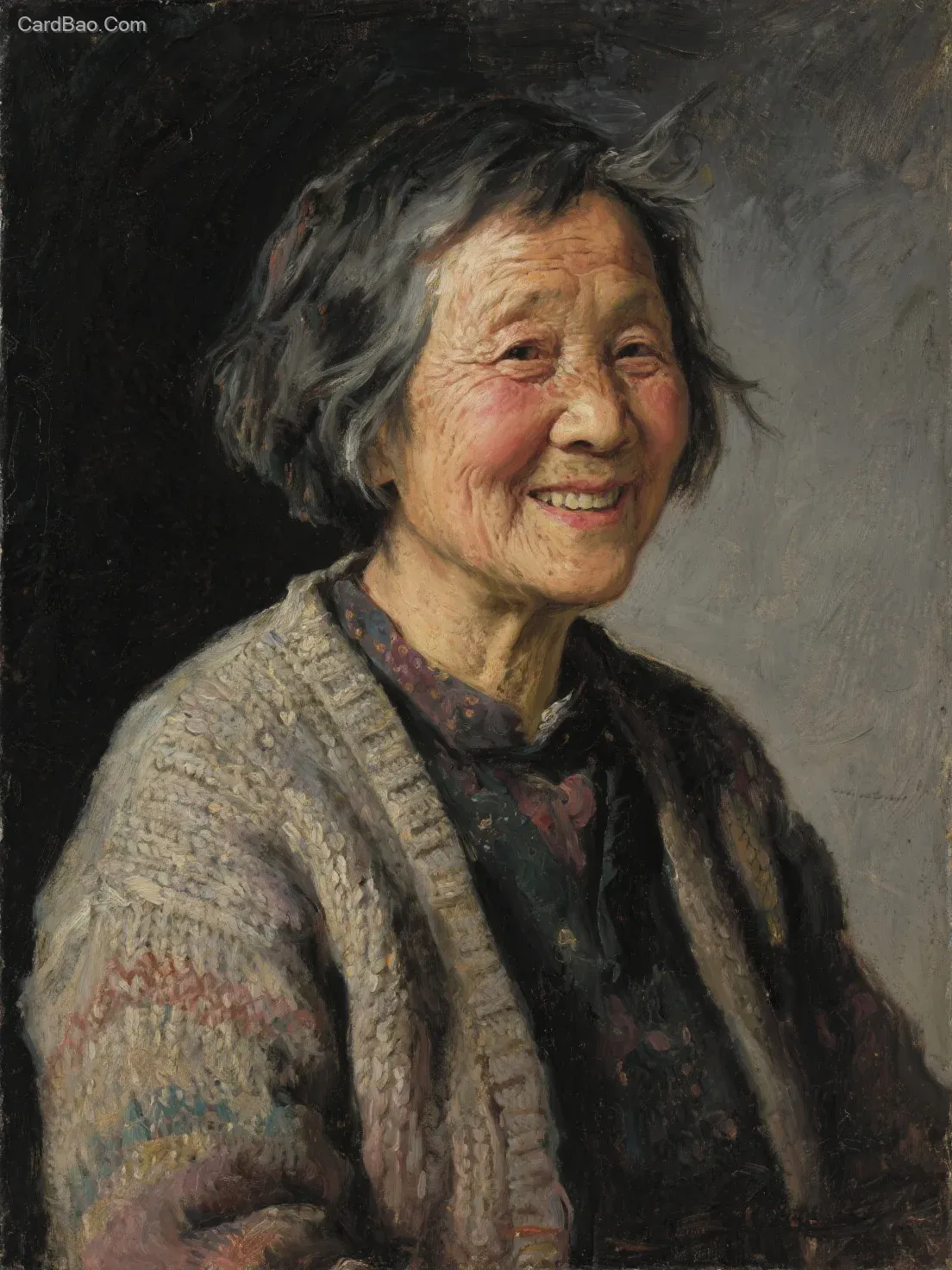 Rembrandt-style self-portrait, oil on linen, with bold yet subtly refined brushstrokes, depicting a cheerful elderly Chinese woman wearing an exquisite knit cardigan. Her short, ear-length hair is tousled by the wind, captured in a half-profile pose. The lighting is masterful, highlighting her kind and gentle expression, with delicate strands of hair visible. The palette features Morandi colors, set against a dark gray background. The overall style is impressionistic.