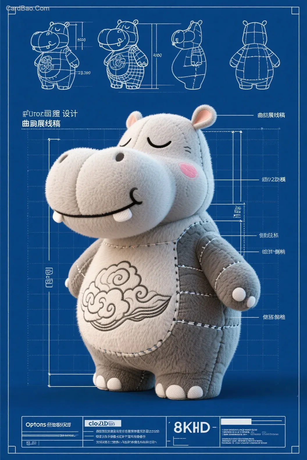以蓝图的风格,为毛绒玩偶制作,设计草图。以河马为元素,并包括尺寸和解释性文本注释,中文的设计说明。曲面展线稿图,面料拼接图,正面,侧面,后背,毛绒玩偶应该被描绘成一个闭眼微笑、身上纹着祥云,梦幻联动有着夸张特征的形象,应使用线条和测量值来指示各个部位的尺寸,给草图以技术和详细的感觉,clo2D建模,开片图。除了主要设计外,还包括显示4分之三侧的角度,不同角度的零散缩略图和Optimus Prime.8kHD的其他细节