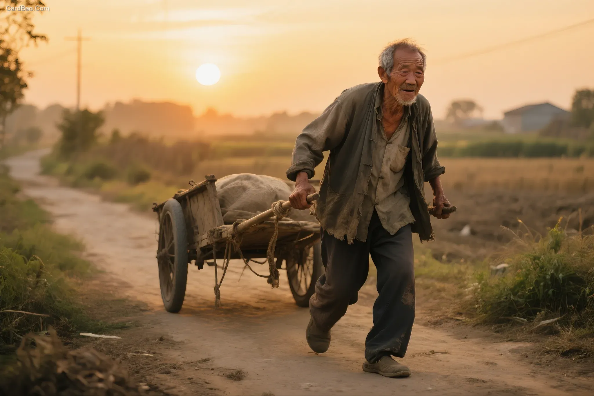 一位面相慈祥和蔼可亲的老父亲,拉着车,艰难费劲地走着,父亲节主题,写实风格,中景,辛苦疲惫氛围,暖黄色调