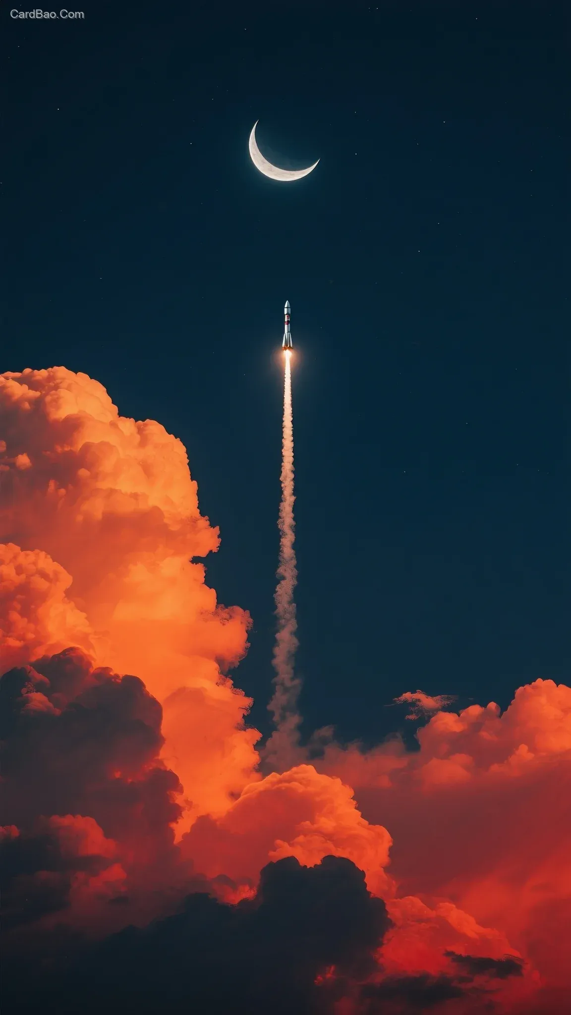 Nightfall, a deep blue-black sky, above the magnificent orange-red clouds, a rocket soars upward leaving a long trail, with a crescent moon hanging high and vertically above it—technology and nature in perfect harmony. Ultra-wide shot, extremely minimal: just the rocket and the moon.
