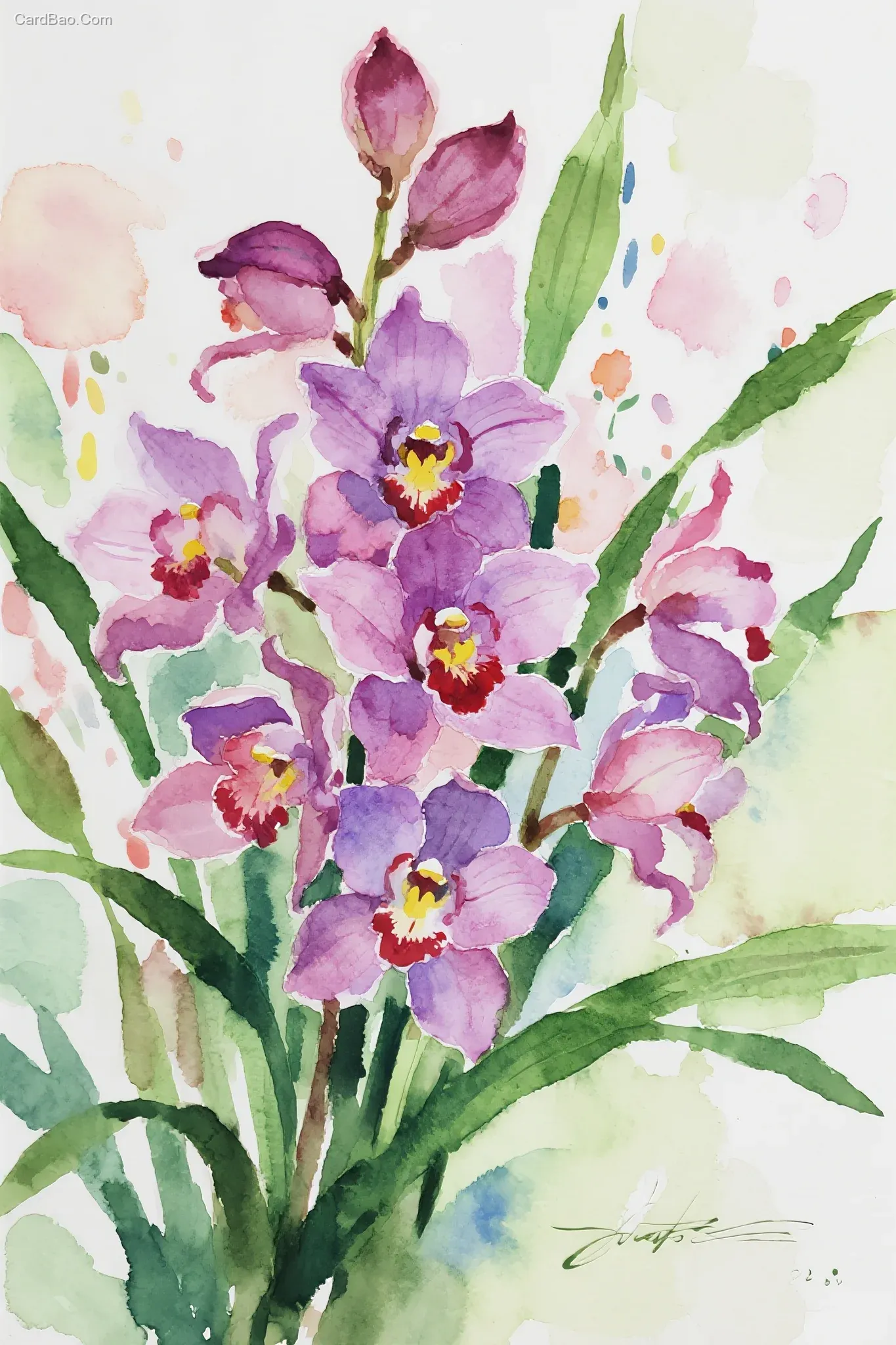 An artistic watercolor painting featuring a cluster of vibrant and elegant Cymbidium orchids. Utilizing the unique translucent and blending effects of watercolor, the composition showcases rich and intense colors—the flowers are primarily rendered in soft pink-purple hues with delicate color variations on the petals, while the stamens are highlighted with bright yellow and red tones. The background is adorned with freely blended green leaves and complemented by multicolored, dreamy watercolor washes to create an atmospheric effect. The overall visual is lively, vivid, and bursting with color, embodying the fluid charm of watercolor while capturing the delicate beauty of the flowers. The signature includes artistic calligraphic elements for a refined finish.
