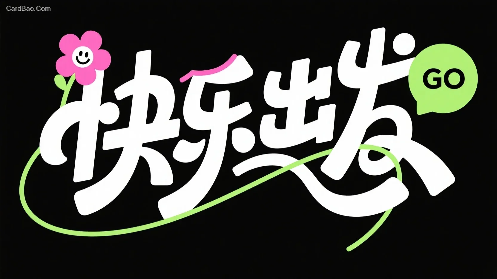 黑底白字,创意字体设计“快乐出发” ,线条流畅动态感强,将字体进行抽象变形,一排字,字体与字体间有笔画连接,创造独特的节差和动感,左侧搭配一个带有表情的粉色花朵装饰元素,右侧有一个绿色圆形对话框样式、里面写着 “GO” ,整体设计风格活泼、醒目,具有强烈的视觉冲击力。
