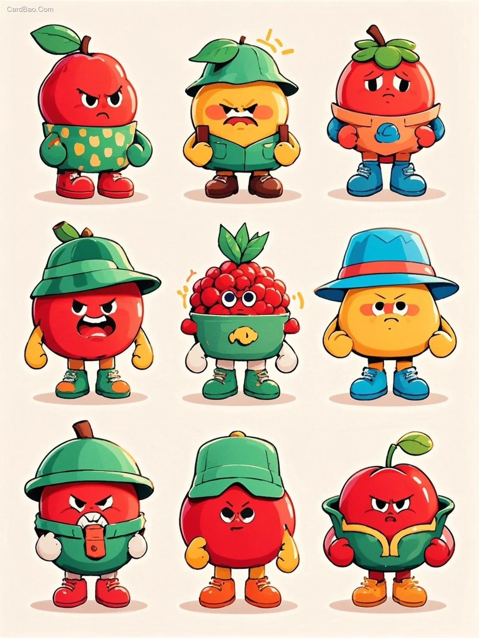 图片主体:一个可爱搞怪的动漫版水果宝宝,脸部特征,上半身或全身,带各种款式帽子