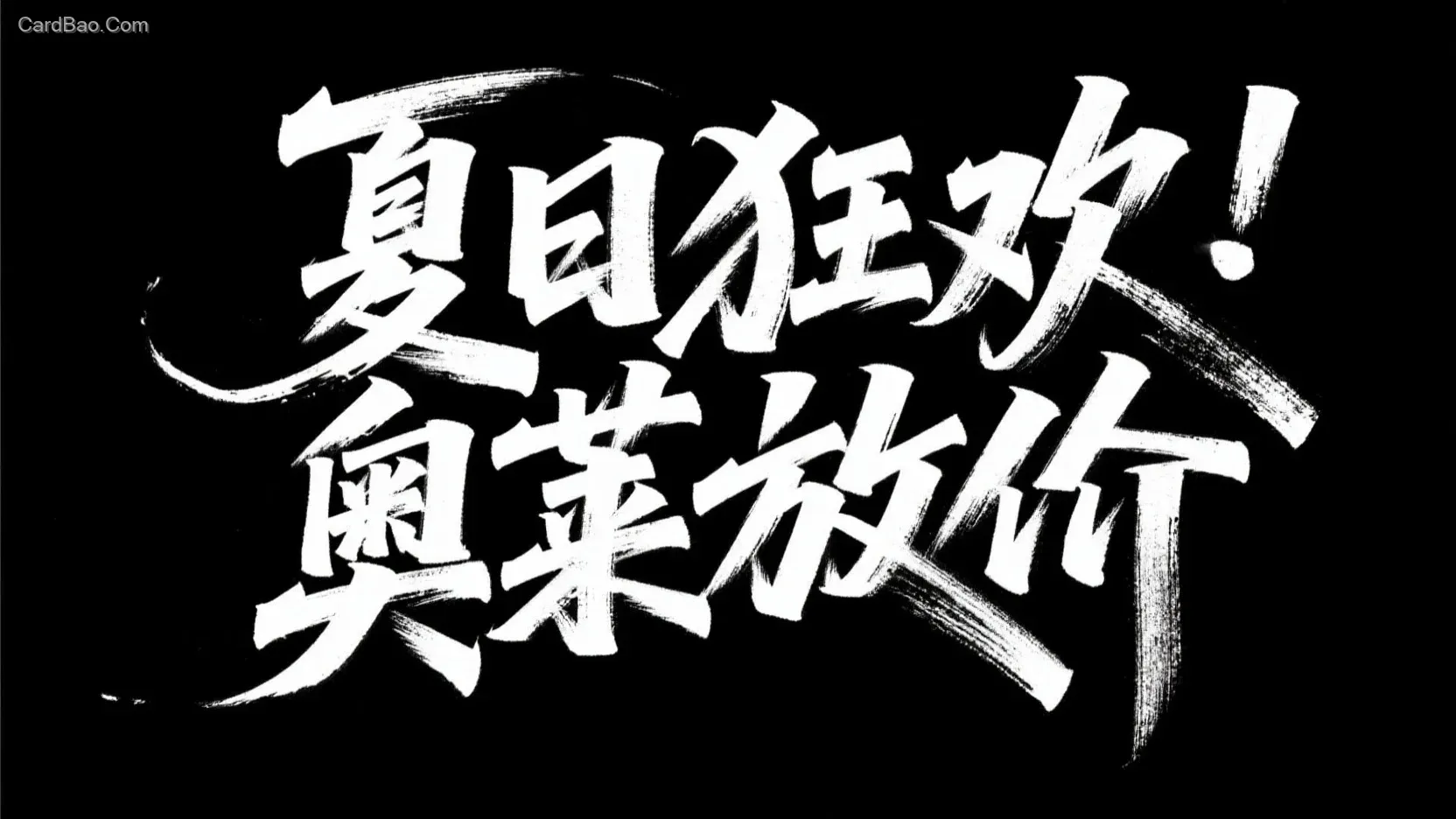 书法字"夏日狂欢 奥莱放价",字体狂野奔放如龙蛇竞走,笔画飘逸带有枯笔飞白,墨色浓淡对比烈(焦墨与枯笔交替),笔势如骤雨旋风富有动感,字形结构夸张变形呈现张力,纯黑色景,参考以下细节,笔法:逆锋起笔,横扫收笔,中锋侧锋交替节奏:快慢交替,章法:字间大小悬殊(最大字是最小字的3倍)特效:墨迹边缘有自然晕染,比例 「16:9」