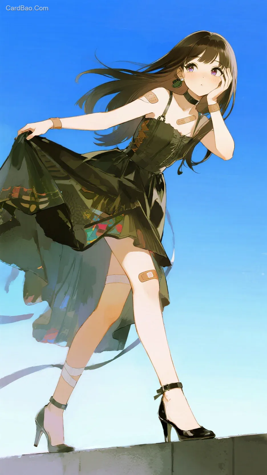 融合Becca Doodlefly、Sandara Tang的细腻渐变和天野喜孝的飘逸装饰,使用水彩厚涂技法搭配哑光质感,强调人物轮廓,整体呈现胶片颗粒感与电影风碰撞的美感。俯视镜头,都市感,高斯模糊,晕染,阴影细节丰富,透视感强烈,波普艺术融合野兽派风格。Lnplick风格时尚韩系美少女,创可贴,全身,高跟鞋,俯视角,风吹起裙摆,用手按住动作,羞涩表情,蓝天背景,眼线,眼影,长直发,波波头,发尾翘起,动人,动感,飘逸头发,发丝划过脸颊,突显发丝凌乱美,氛围感,眼部特写,m形唇,杏眼,阴影,暗调前景。