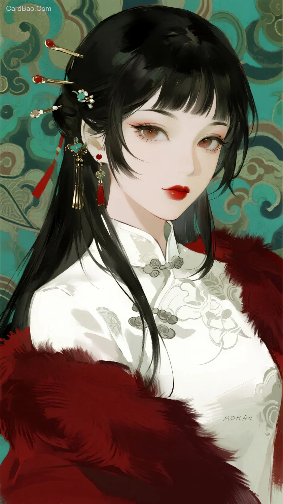 手绘插画,中式美学,国风插画,笔触感,肌理感,御姐,公主切长直发,浓眉大眼,长睫毛,红唇,温婉如玉,长发飘飘,白色丝绸旗袍,上有精美图案,酒红色毛绒外披,面部特写,白面红唇,精致,大小姐风范,女主,风华绝代,精美发簪,邪魅,高冷,慵懒,黑发,背景是复杂绿青色图案渐变背景,精美做工,右下角签名MOHAN