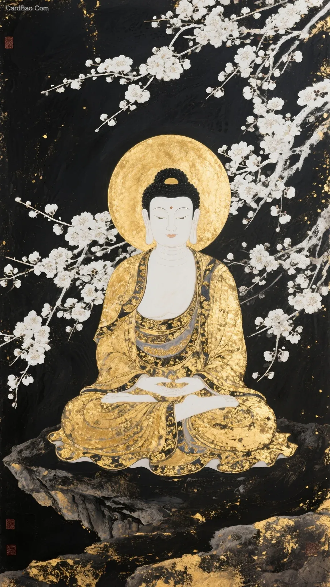 岩彩绘画 金箔岩彩 磨砂肌理绘画 黑金色岩彩背景 白色梅花 大面积留白 笔触感 肌理感 中式 禅意 静谧 典雅 朦胧美 极简,有阿弥陀佛,头顶有金色光环,面如满月,慈悲,结跏趺坐,衣服华丽,重彩
