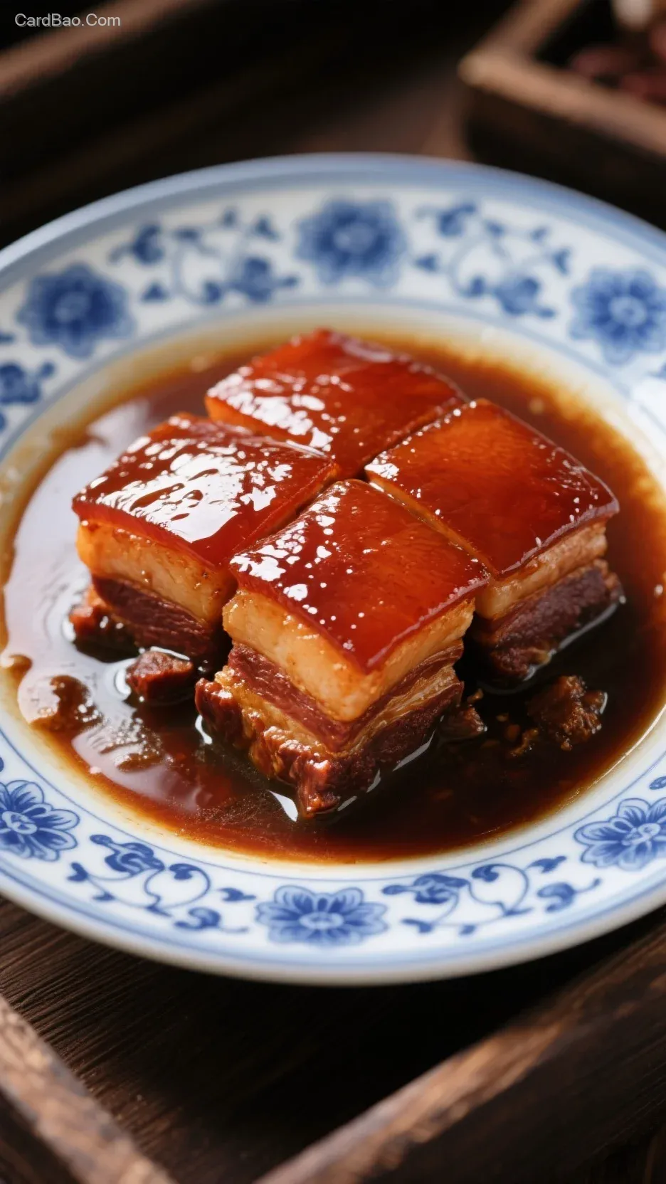 In the center of an exquisite blue-and-white porcelain plate sits a piece of Dongpo pork, its color a rich, glossy red, fatty yet not greasy. The glistening skin appears so tender that it seems a single bite would release a burst of fragrant juices. The surrounding sauce shimmers slightly, exuding an irresistibly mouthwatering aroma. The intricate patterns on the plate complement the pork, enhancing the dish's rustic elegance.