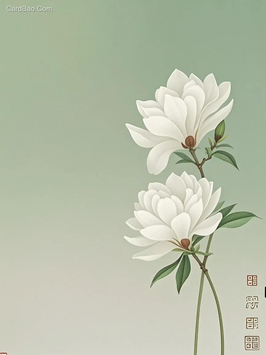 ##新古风工笔画,两朵白色木兰花,简简单单,背景清新绿色,单一高级,超高清,颜色单一,唯美高级,画面干净,花朵在右侧最下方,不要人物,花朵高度不要超过一半