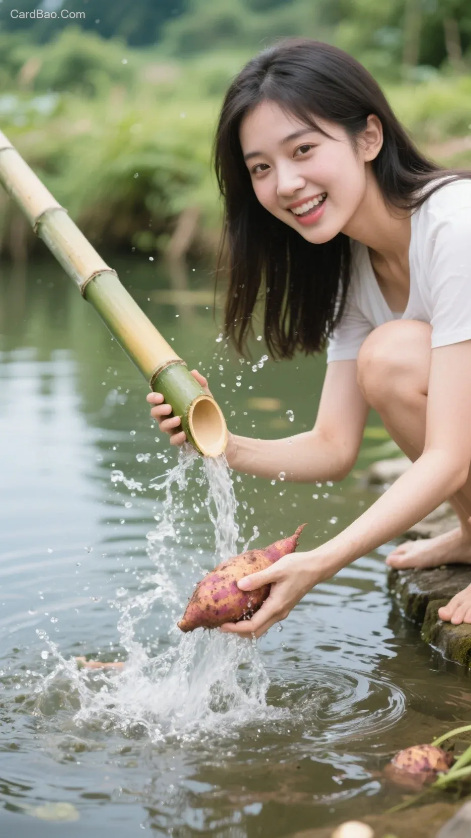 小姐姐在水池塘边洗红薯,气氛活跃,水从竹子里流到水池,水花四溅。画面清晰写实超高清镜头生成图片