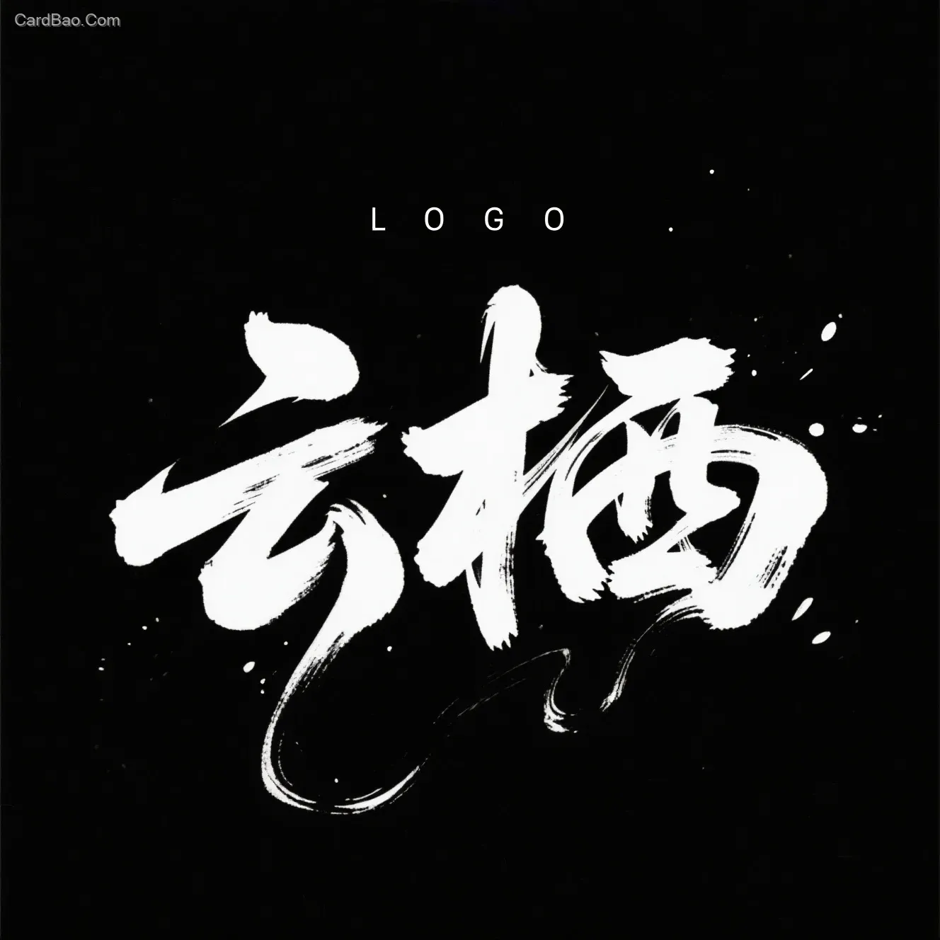 字体设计“云栖”,标题LOGO设计,数位板写手写泼墨,笔画龙飞凤舞,大气磅礴,草书,笔画唯美,背景干净,黑色背景。