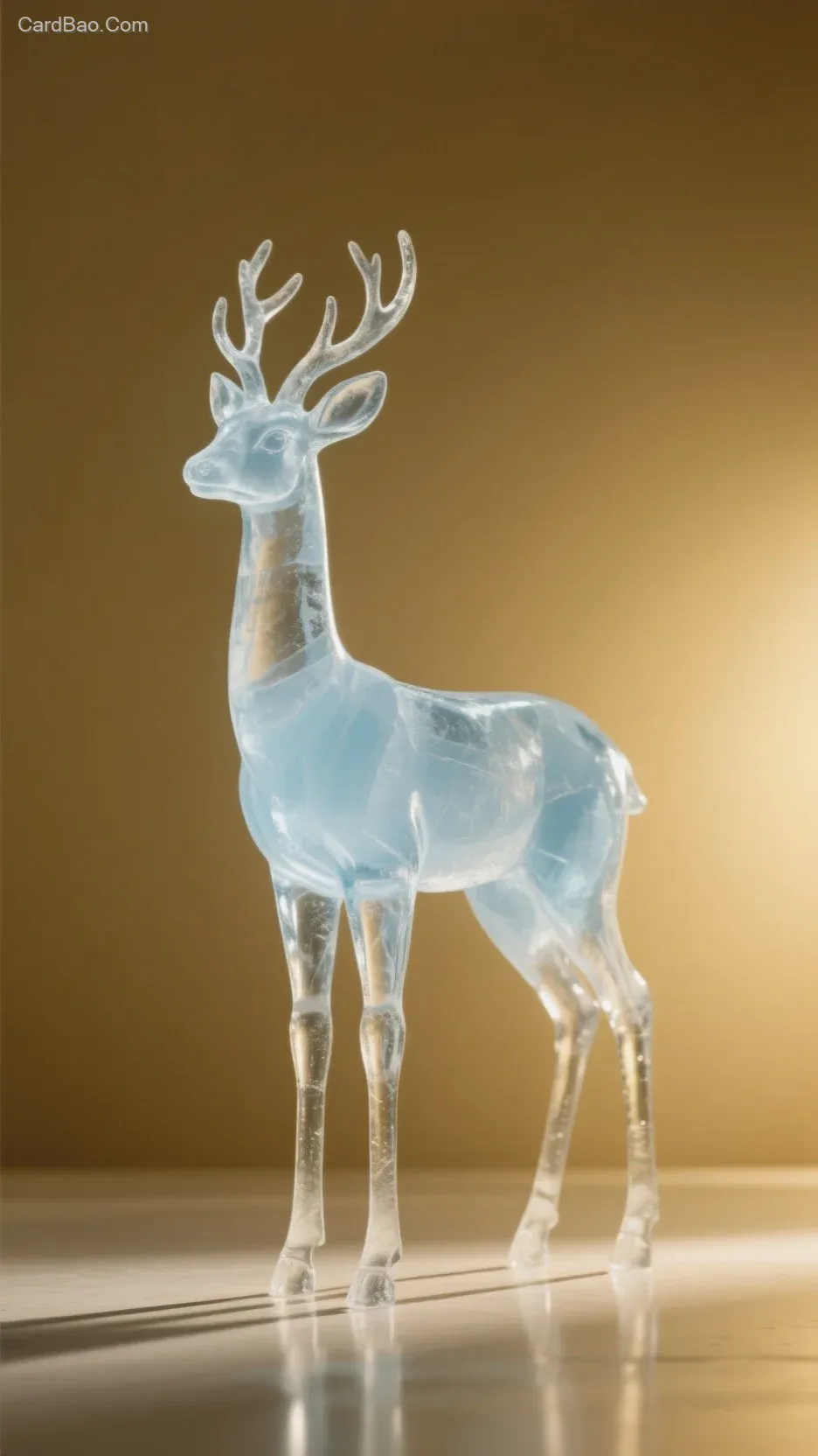 在光线充足的工作室环境中,金色背景简洁,有一只全身梅花鹿冰雕以简单笔直的姿势站立。这个雕塑用光滑透明的冰捕捉了整个形态,展现出微妙的面部特征和身体上简约的细节,呈现出优雅、抽象的外观。柔和的晨光和淡蓝色反光凸显了冰的透明性,强调了这只鹿的优雅、宁静的姿态