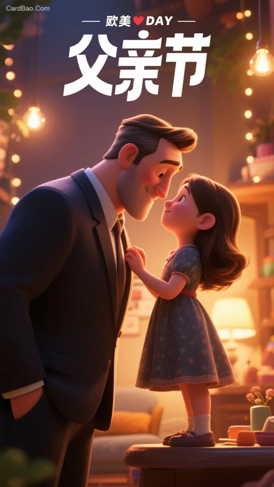 游戏海报,一张展示父亲节父亲和女儿深情对视 氛围温馨有爱 游戏海报、欧美卡通、高度详细、超高分辨率、32K UHD、最佳质量、杰作,疯狂的细节,工作室光,C4D,blender建模,OC渲染。