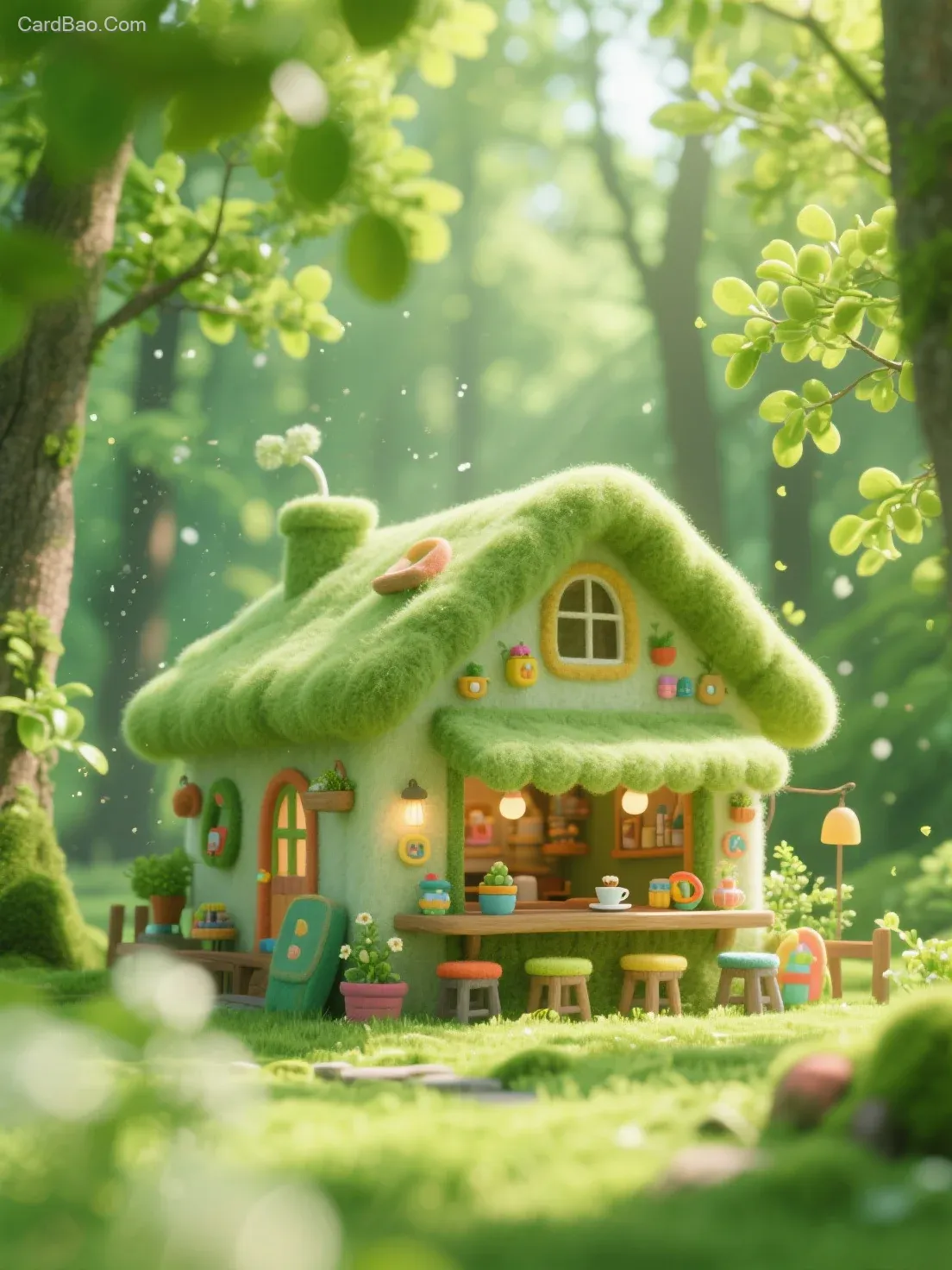 In a vibrant spring forest, sunlight filters through the gaps between leaves, casting dappled shadows. A uniquely designed forest café stands here, entirely crafted in a felted style—from the roof to the walls, everything exudes the soft texture characteristic of felt. Adorned with delicate little ornaments, the café boasts a bright and fresh color palette dominated by verdant green, accented by other lively hues, making it exceptionally eye-catching. The scene appears as if captured through a macro photography lens—detailed and lifelike, with every nuance distinctly visible, as though one could even spot the tiny dust particles stirred by a gentle breeze inside the café.