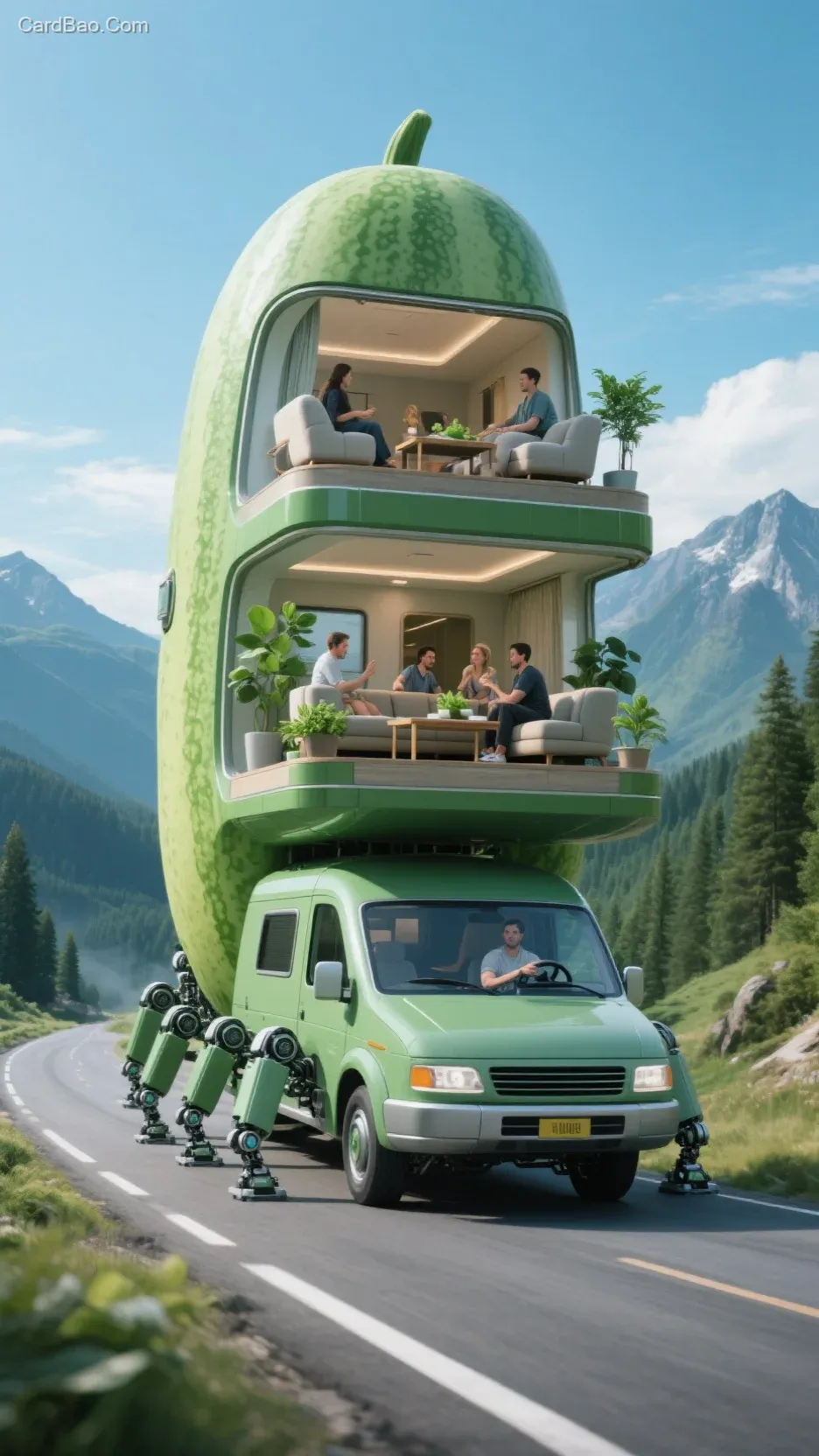 中景 。一辆配有多个机器腿的绿色双层露营车在山间公路上行驶,外观形似黄瓜 。露营车的上层是开放式的客厅空间,布置有沙发、茶几和绿植,几个人在其中互动交流 ;下层是驾驶区,有一人正在驾驶 。背景是连绵的山脉、茂密的森林和晴朗的天空 。