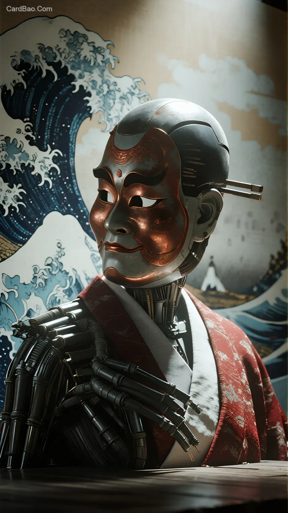 日本能剧「翁」面具与赛博躯体融合雕塑,面具采用赤铜氧化肌理,躯体为碳纤维竹节结构,舞台追光灯在褶皱表面形成歌川广重浪花纹理,16K 超高清画质。