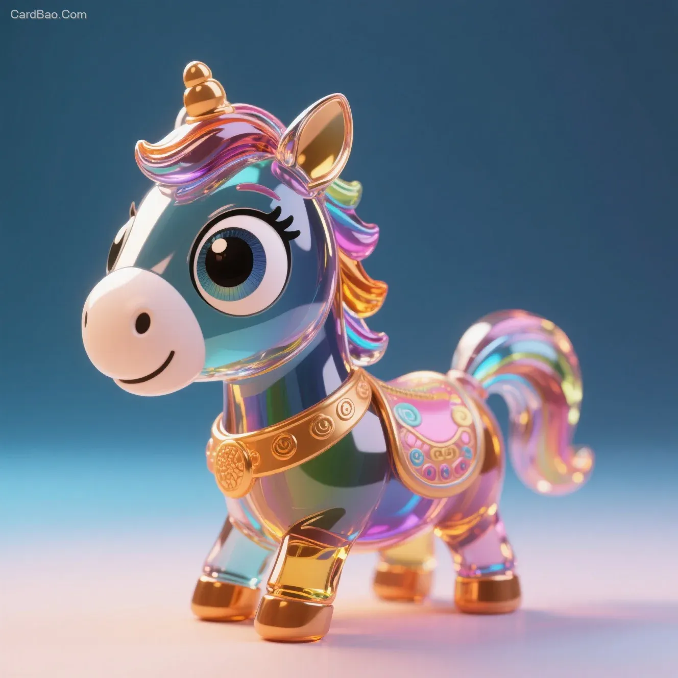 Colored glass craft artwork, a cute zodiac horse figurine with big eyes, front view, C4D, exquisite details, flawless, high-definition resolution, ultra-clear quality
