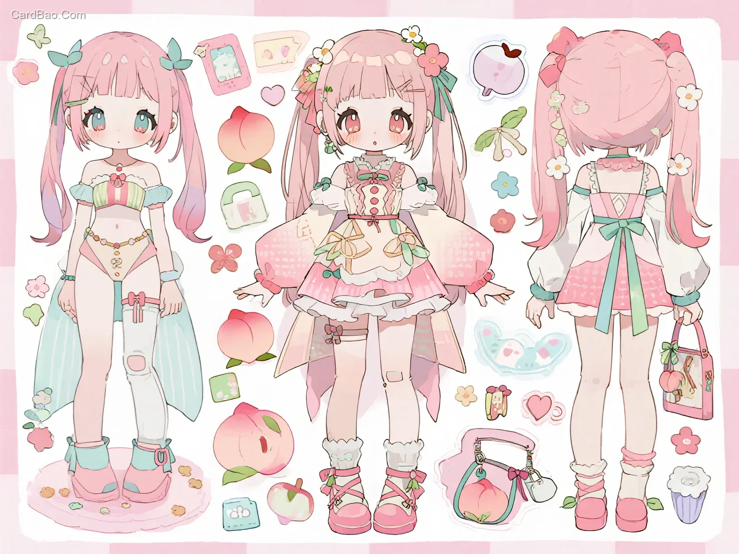 人设设计超详细草图,背景白色,展示了每件作品的复杂设计过程,娃娃的人体模型增加了场景的深度,每个关节都有展示,二次元少女,极具想象力,丰富联想,极具设计感服装,花,人设,超细节。三视图。可爱风格。桃子女孩。服设复杂。人物周围有很多小物品