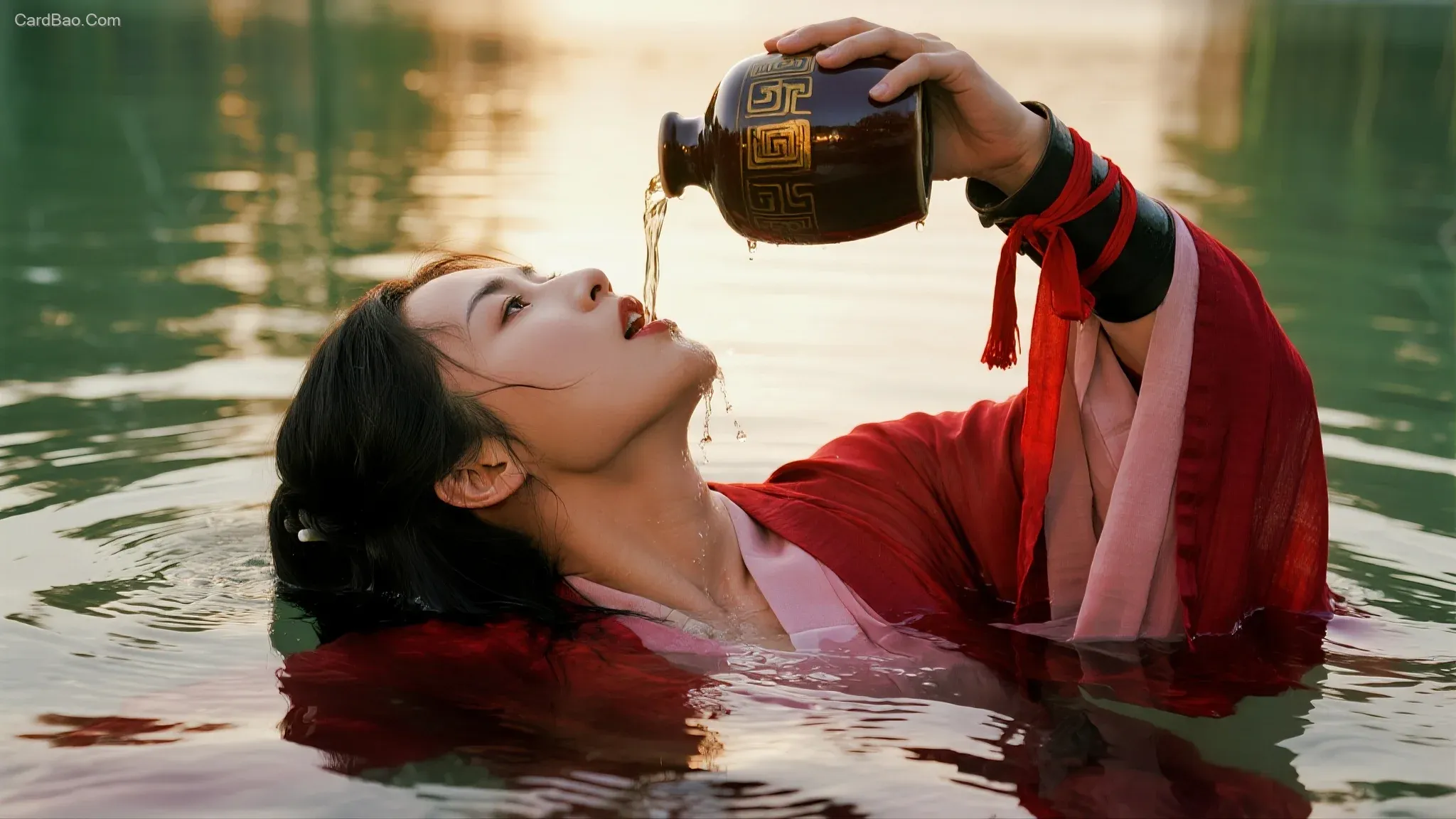 Ancient style, wuxia (martial arts) atmosphere, cinematic quality, epic shot. A young Brigitte Lin as Dongfang Bubai, half-submerged in water, tilting her head back with mouth open in a bold drinking gesture. Her right hand holds an ancient dark ceramic wine flask with gilded patterns (a short red silk ribbon tied around its neck), raised high to pour wine vertically and precisely into her mouth, capturing the dynamic splashes of liquid. Costume: deep crimson wide-sleeved robe (silk texture) + light pink inner garment, with cascading black hair flowing freely. The figure faces the left side of the frame. Background: a tranquil lakeshore at dusk (emerald-green water reflections) + distant hazy bamboo forest, rendered with natural light halos. Shot from a high angle. Overall mood: the carefree boldness of a wandering martial artist, with strong color contrasts (red/gold/green), film-grade composition, 8K ultra-high definition.