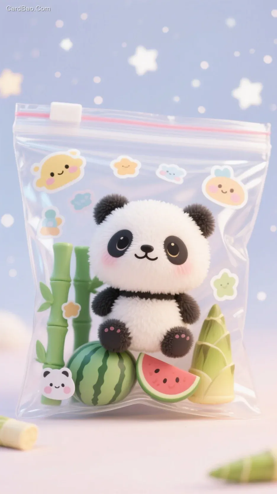 捏捏玩具,解压捏捏,Q版软毛毛熊猫,装在透明袋子里,袋子里有各种可爱的小配件(小竹子、小西瓜、小竹笋等),袋子上有各种小贴纸,可爱星空背景