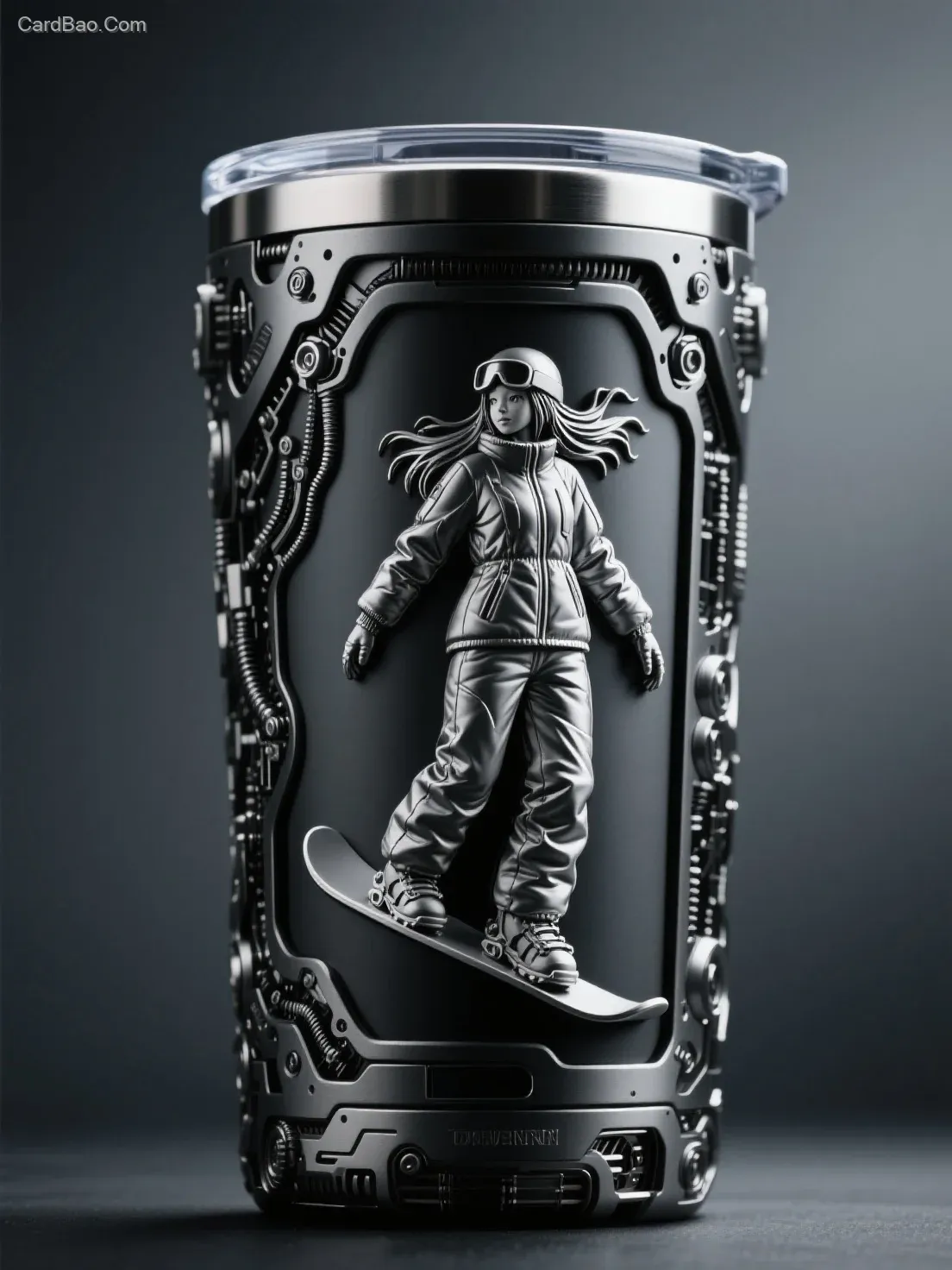 机械化的无盖水杯,艺术品,具有机械构造,呈现出精密机械化风。一个巨大无盖水杯,上面突出的刻画着一个单板滑雪女生,人物立体化,浮雕感,涉及包装设计,产品摄影,突出机械水杯,暗黑风格,雕塑别影响杯子轮廓