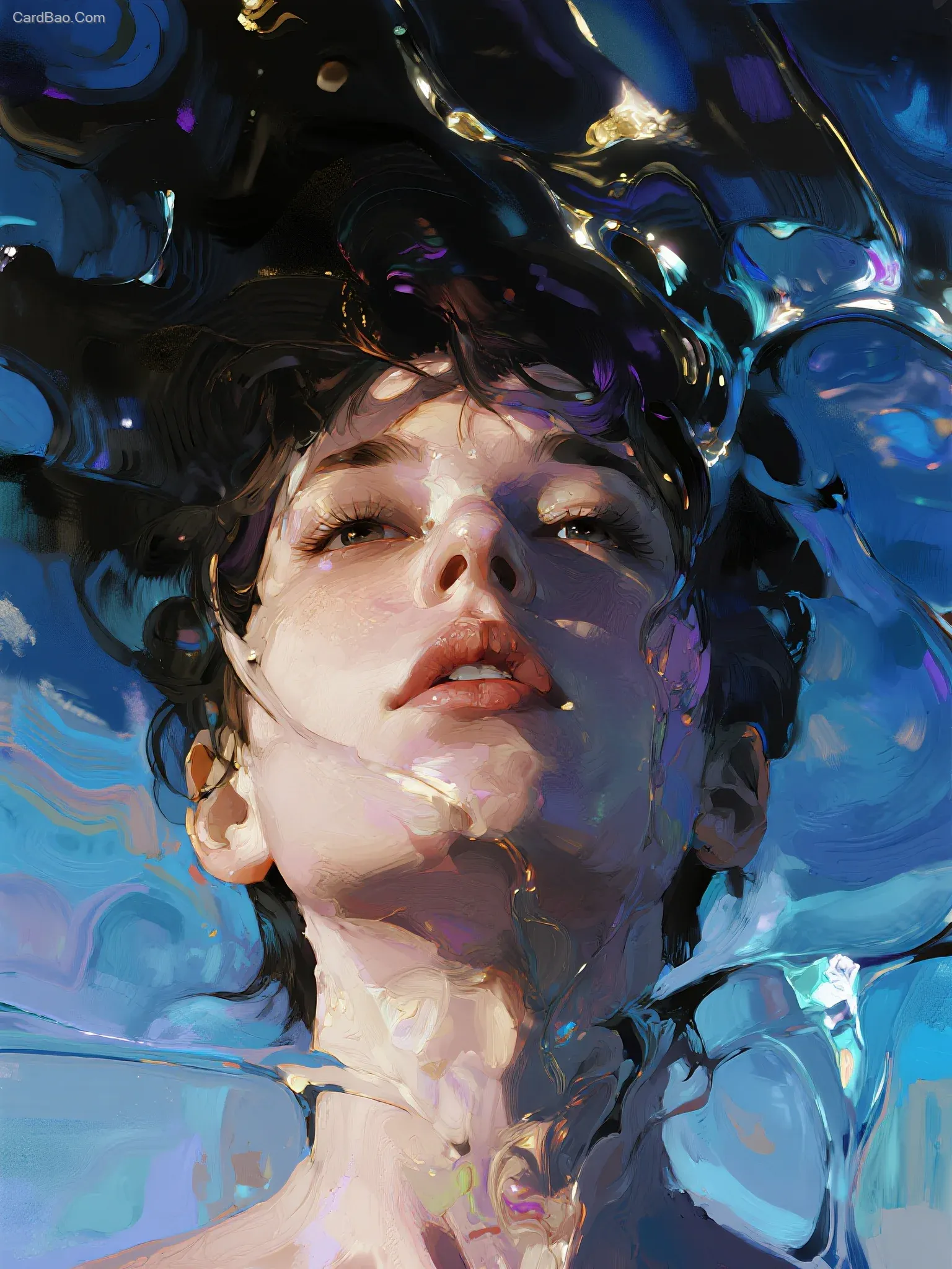覆盖全频幕的液态玻璃,从下至上的仰视视角+动态视角,丙烯颜料,厚涂,人像,颜料的涂抹感+肌理感,超现实主义美学,高级的氛围感,层次感,矛盾冲突的视觉冲击和有机融合,反射,流光溢彩,艺术,高级感,清透感,用光影表现深度和立体感,高品质细节,情绪表达和叙事,阴郁,艺术插画,模糊感,颗粒感,大师作品,运动模糊,液态玻璃加上一层多彩弥散渐变风格,画面一半是虚化的运动模糊效果,超现实,艺术氛围感加强,仰视视角,肌理感,丙烯人像插画,使背景与前景相互融合,打破常规,反设计,超越时代,虚实反复穿插,非传统构图的艺术,耀变+反射,梦幻+微光,高级的氛围感,通透,发光,蓝+黑+紫+金,神性+极致的压迫感