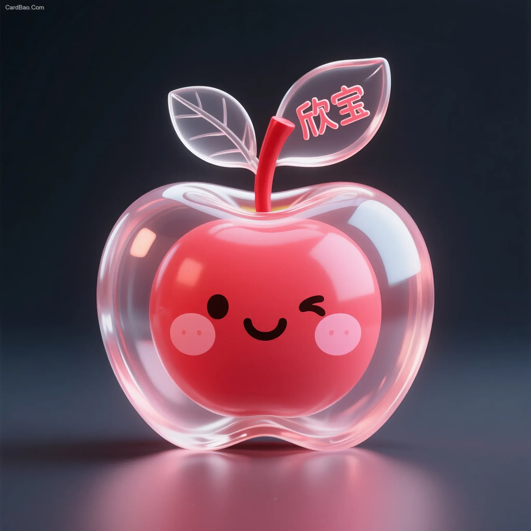 可爱精致风格,深色背景,透明苹果造型(内有红色卡通笑脸元素,带腮红 ),顶部有透明叶子、红色果柄,叶子上刻有文字“欣宝”,营造出可爱、精致的氛围。