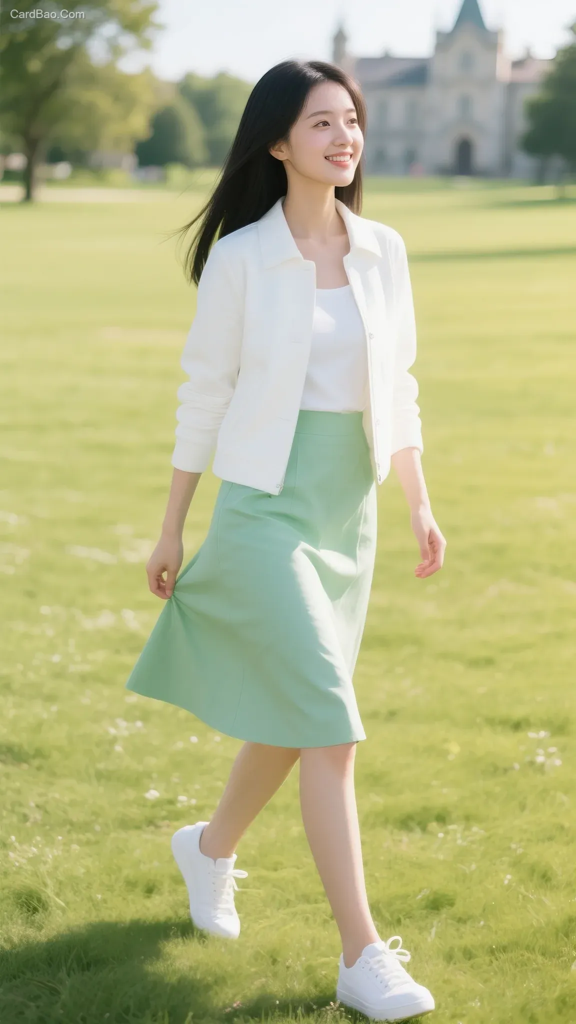 7. 上身白色外套(色号#FFFFFF),浅绿色半身裙(色号#98FB98)至小腿中部