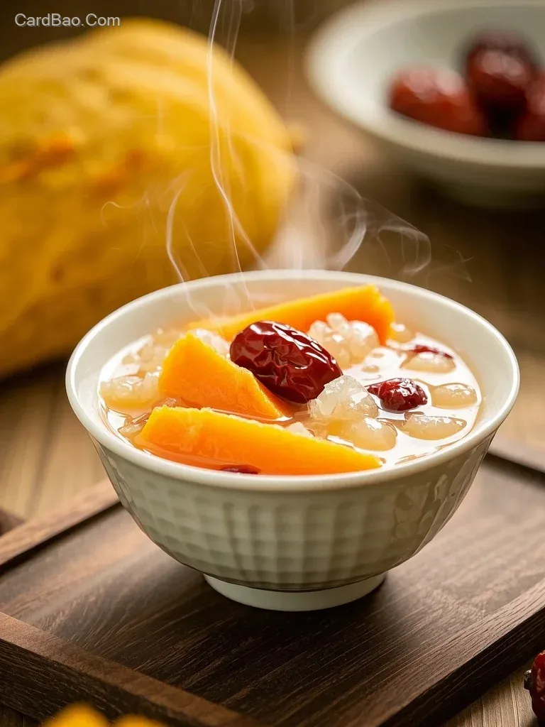 A steaming bowl of sweet potato, snow fungus, and red date soup, with sweet potato as the main ingredient, displaying an appetizing orange-red hue. It dispels the summer heat and brings a refreshing coolness.