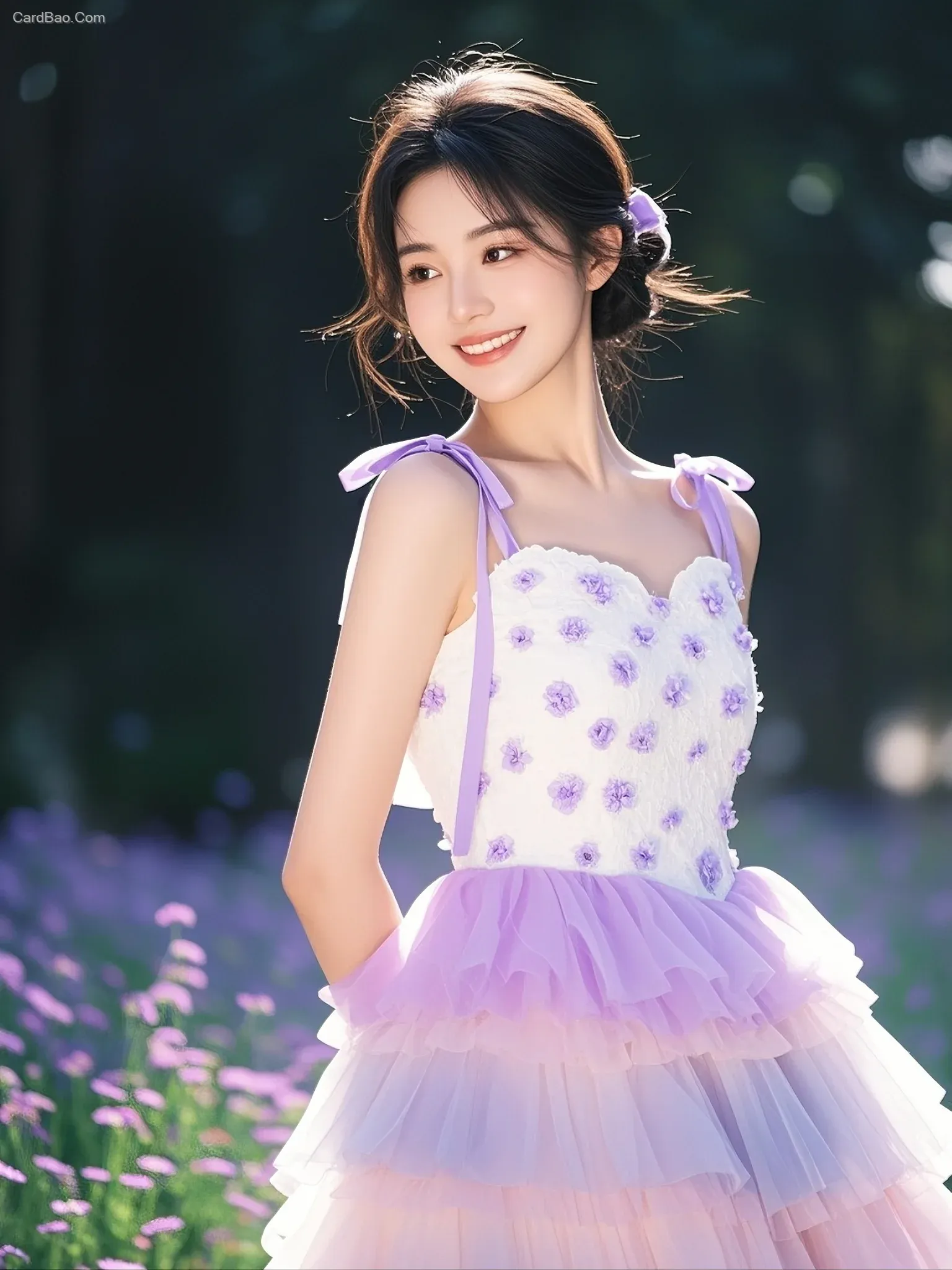 专业人像摄影,光影,艺术人像,女子面容绝美,身穿浅粉与淡紫交织的糖果色蛋糕裙,裙摆绣细小的紫色花朵,紫色花田中,身姿轻盈,眼神柔和且明亮,面带微笑,肌肤白皙细腻有光泽。黑发、精致盘发系淡紫色蝴蝶结,正面照,超高清摄影写实。唯美意境,光线自然和谐,超高清图。光影艺术,精致人像,唯美光影,魅力人像,创意,细腻光影,光影中的人像,极简,高级感,梦核,朦胧感,模糊感,情感表达,独特视角,卓越画质,创意构思,精准构图,高级白,温暖色调,银色流光