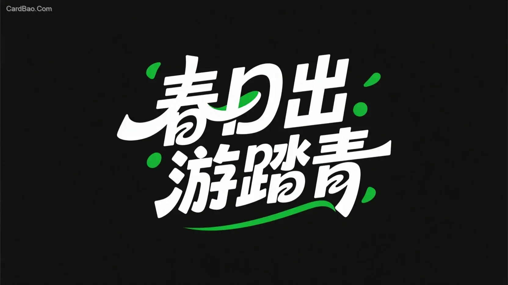 矢量插画,标志,黑色背景,白色字,创意字体设计Logo,流畅且富有艺术感,中文“春日出游踏青”,绿色点缀。设计灵感:将字体进行抽象变形,给人以强烈的视觉冲击。高级感,扁平化,大师作品