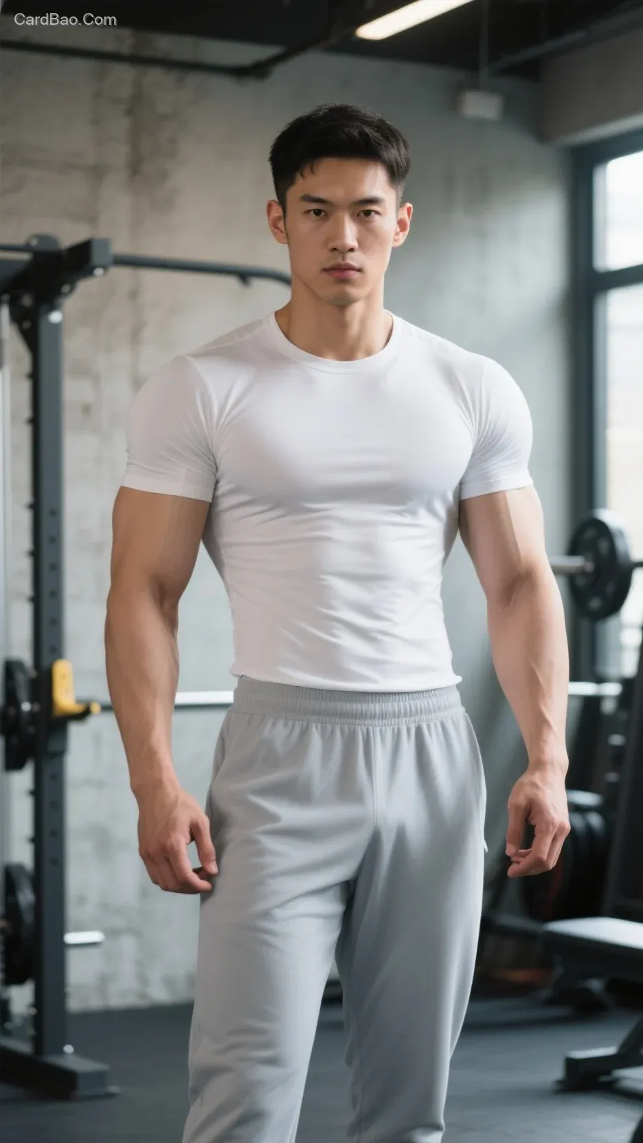 8K Ultra HD, vertical composition, realistic style, gym setting. A muscular male with a well-defined physique, wearing a white fitted short-sleeve shirt and light gray athletic pants, showcasing his strong and chiseled body. His masculine, bold, and determined demeanor exudes bravery, as if forged from steel, with a steadfast warrior-like gaze. The background features gym walls and equipment, with natural lighting accentuating the powerful presence of this fitness enthusiast, creating an energetic and dynamic workout atmosphere.