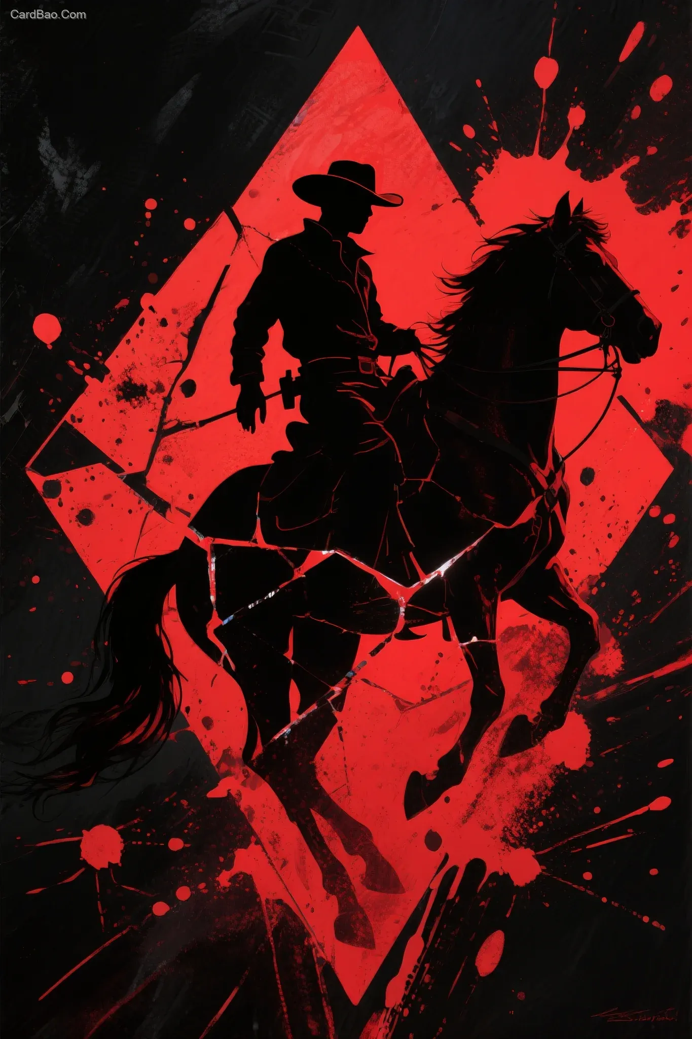 西部牛仔侧身剪影驾驭烈马,暗红墨迹泼洒动态轨迹,破碎菱形色块重构形体,深渊黑背景流淌血色光晕,新表现主义绘画,非对称构图,尖锐三角元素重复,故障艺术纹理叠加